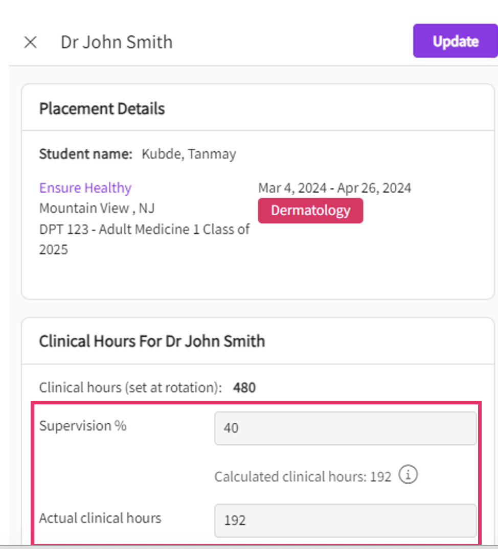 - A drawer will open. Update the Supervision % and click Update. The Actual Clinical Hours will automatically update.