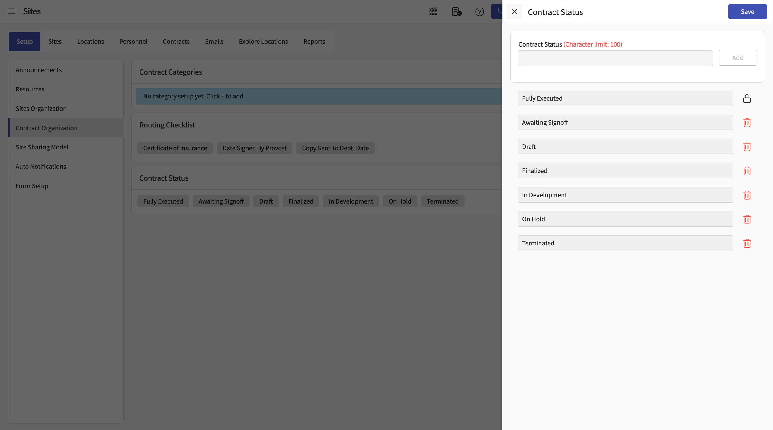 - Shared contracts: Status managed at the institutional level, accessible to all programs.