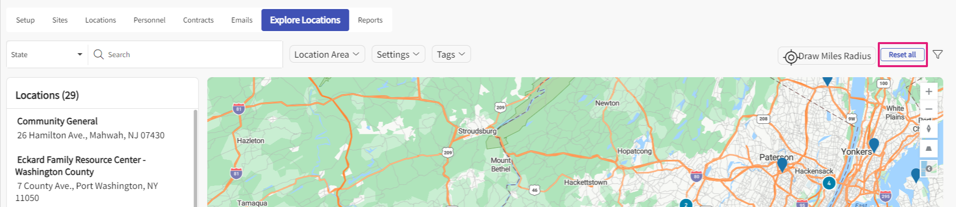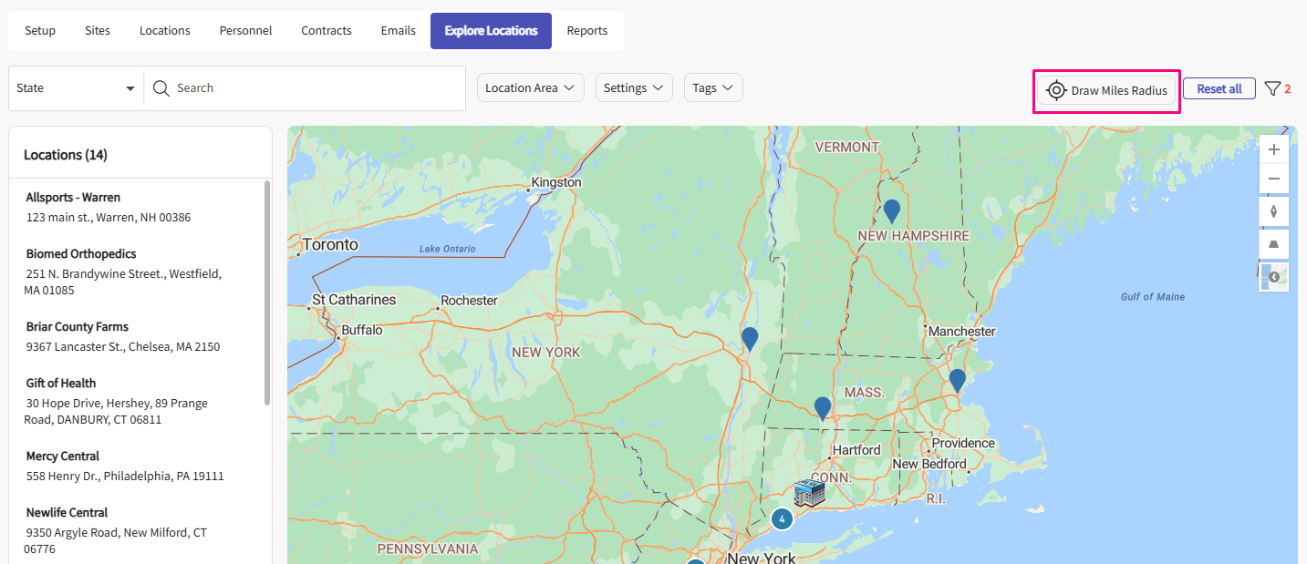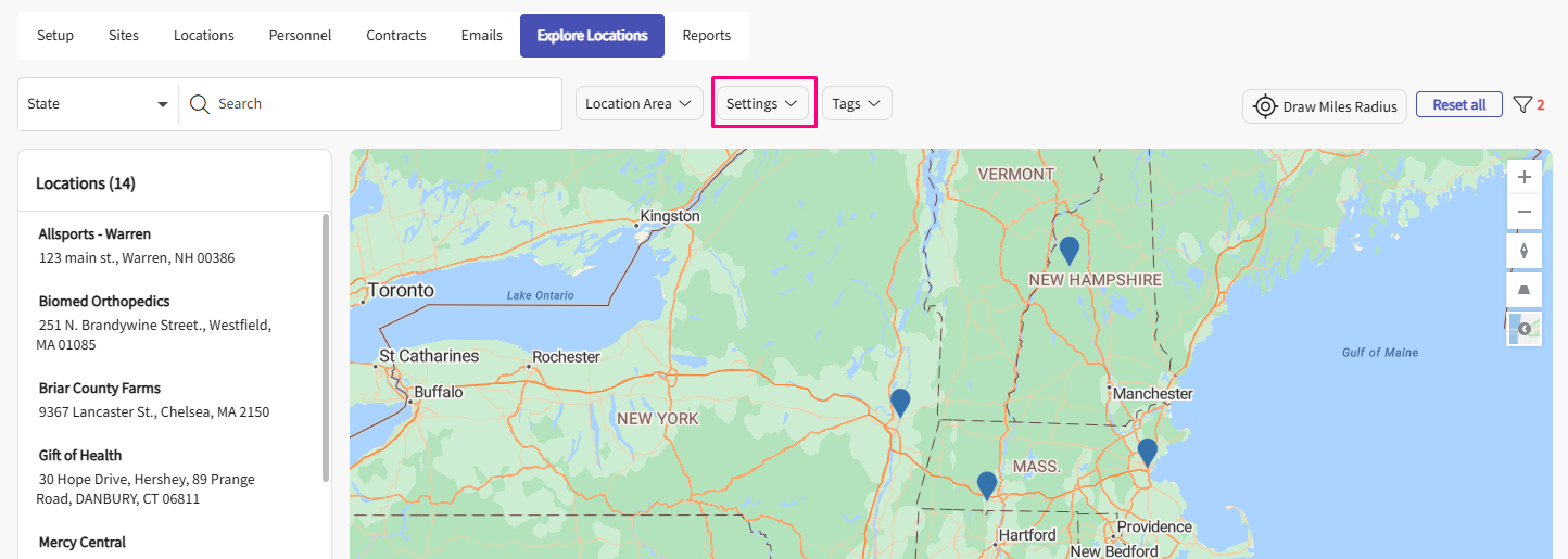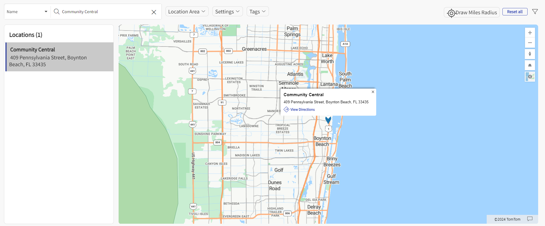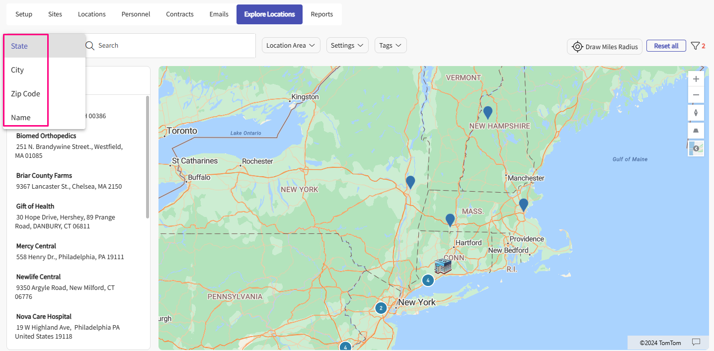 - If you are looking for a specific location, use the search bar. As you type, the list will filter accordingly, and the map will only display pins for Locations on the list.