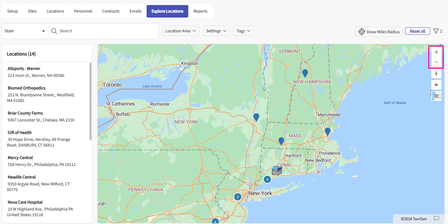 - All the locations will be displayed on the map. To view them, simply zoom out using the – icon.