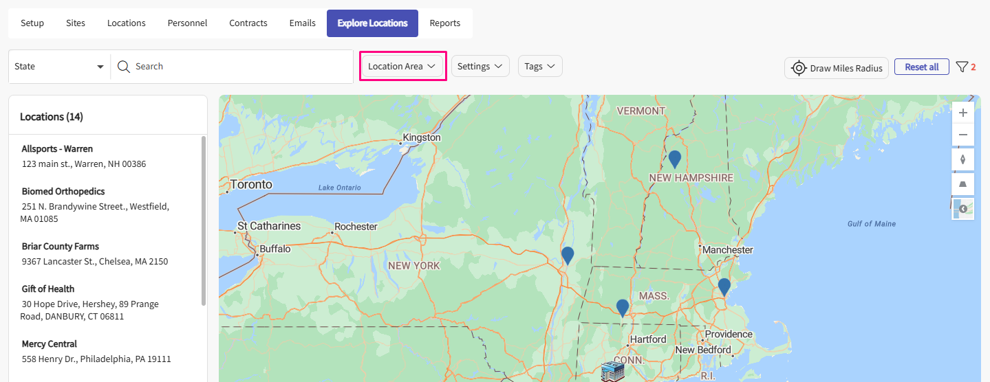 - You can also filter by Location Area (e.g., In-area, Out Area, Out of State) when searching for locations.
