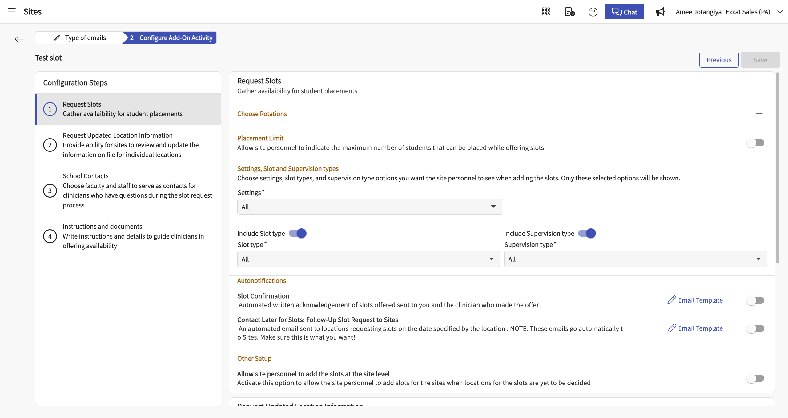 Customize the settings and slot types that sites will select from if needed. Or turn the switch to exclude the section on the slot request for your sites completely.