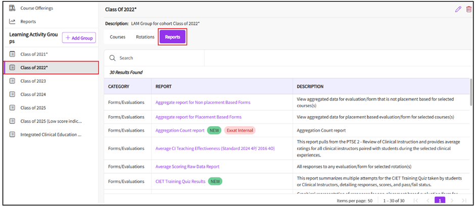 - To view reports for the learning activity group, select the learning activity group and go to the Reports tab.