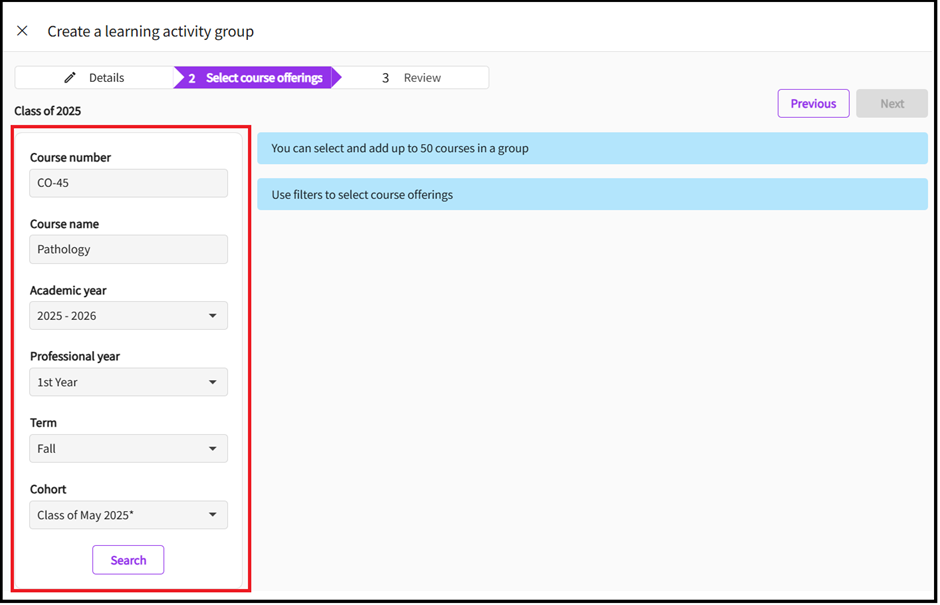 - In the Select course offerings section, search for the course using the Search filters in the left pane.
