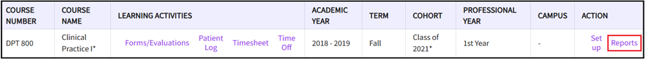 - To view reports for a particular course, click on the Reports link in the Action column of the course details.