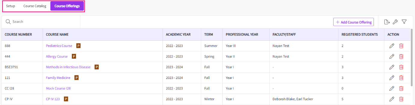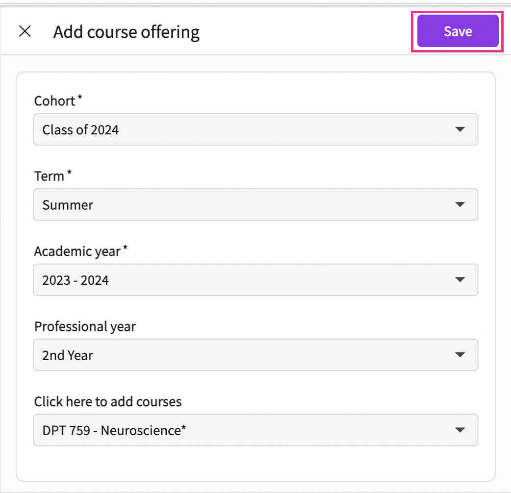 - You can also create a course offering by clicking on "Add Course Offerings" and entering essential details such as Term, Professional Year, and Academic Year, and selecting the specific course. Once you click save, a new course offering will be added to the system.