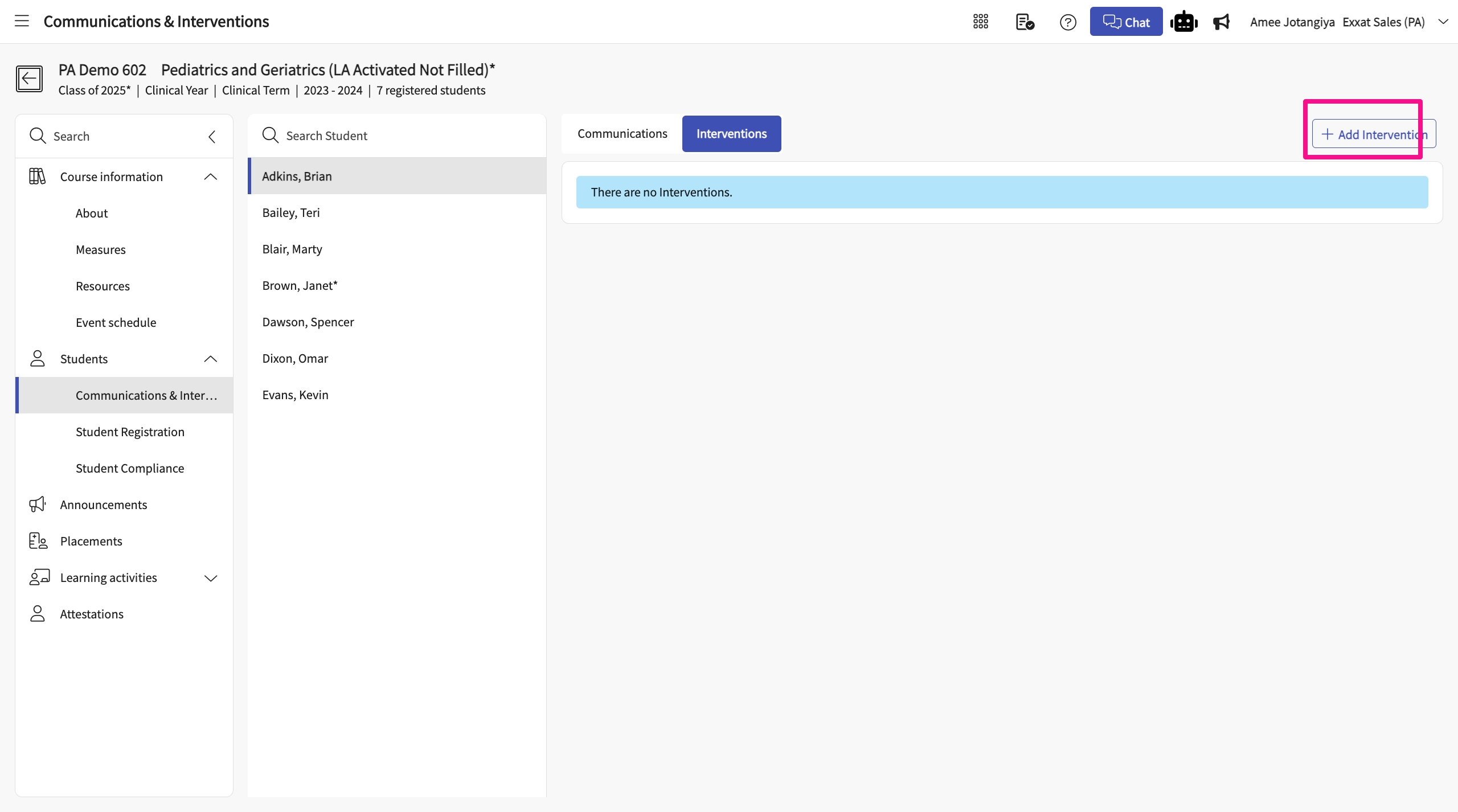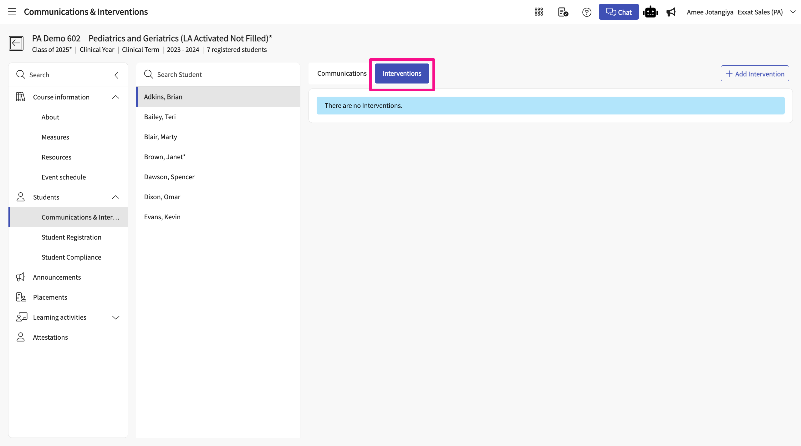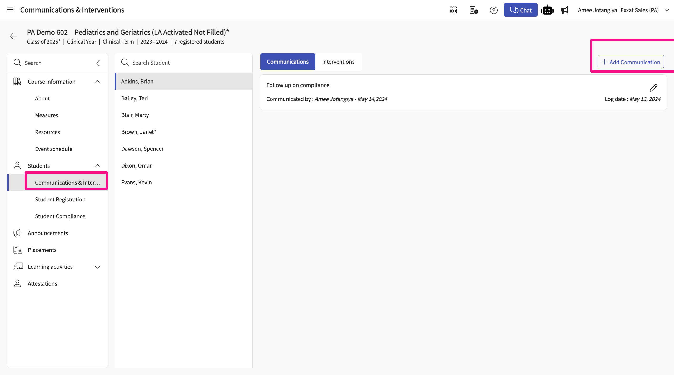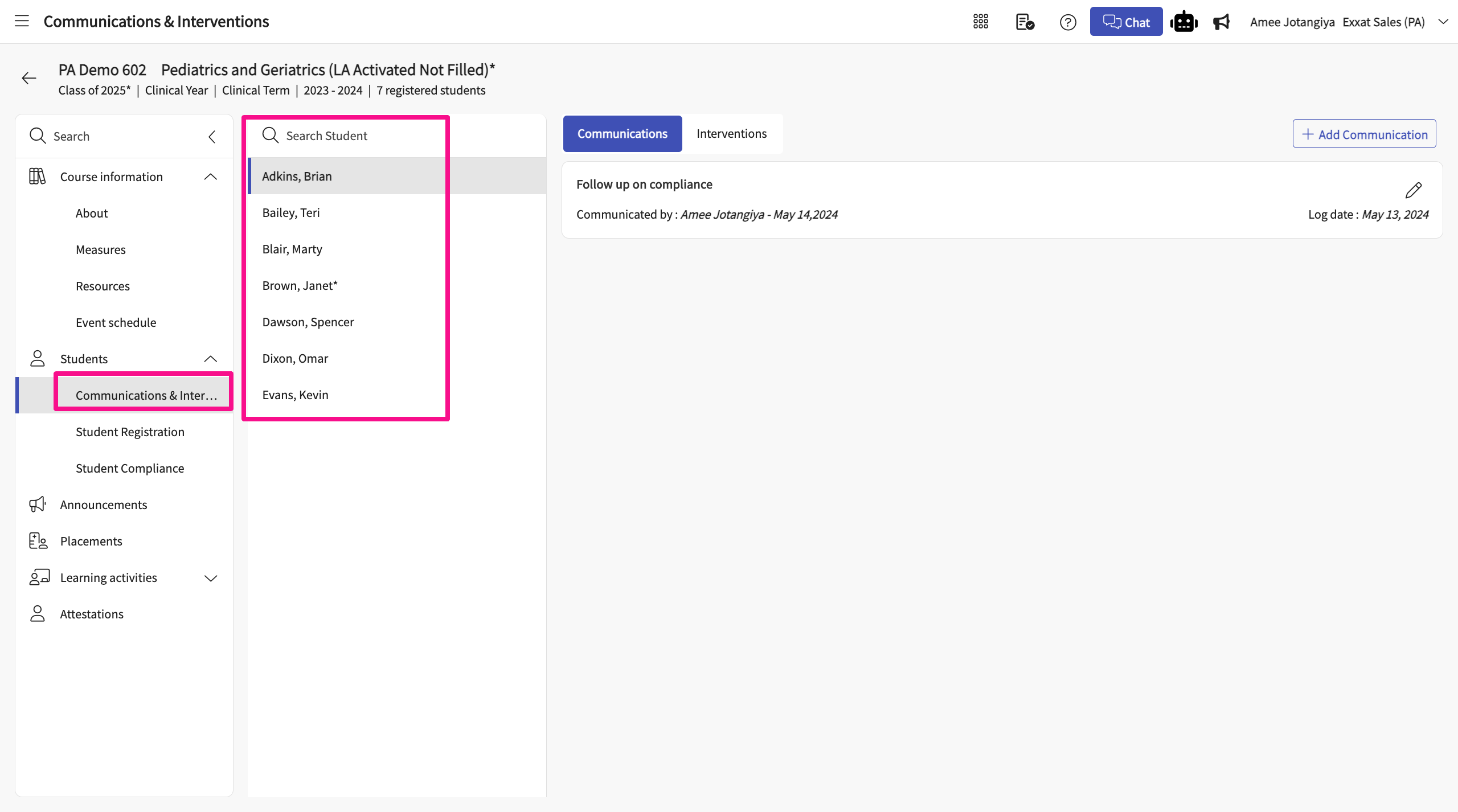 - When you click on a course offering, you will find the “Communications & Interventions” page under Students. Click on it.