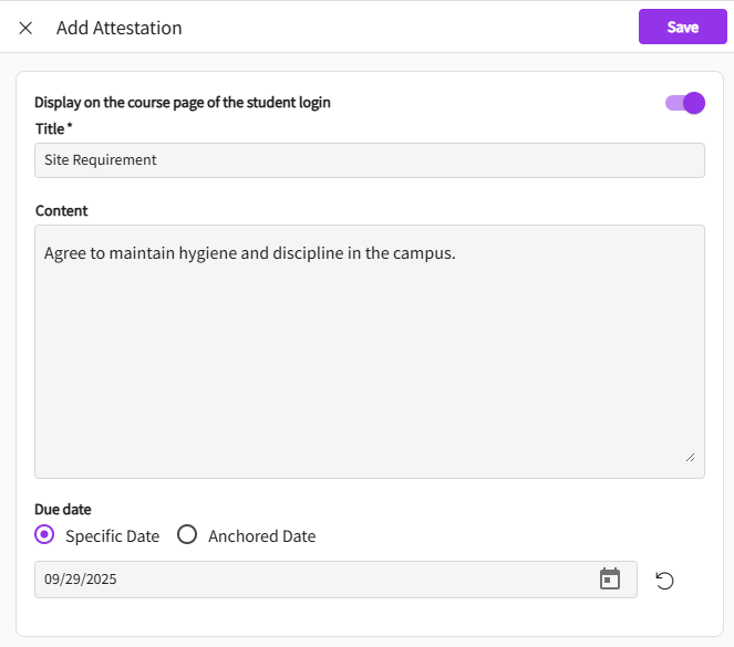 You can add course-specific attestations for registered students. You can add attestations to agree to terms and conditions for the site specific requirements.