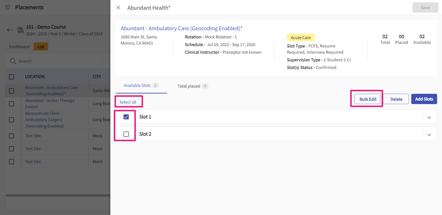 - On the Available Slots list, select the checkboxes or Select all to select all the slots and click Bulk Edit.