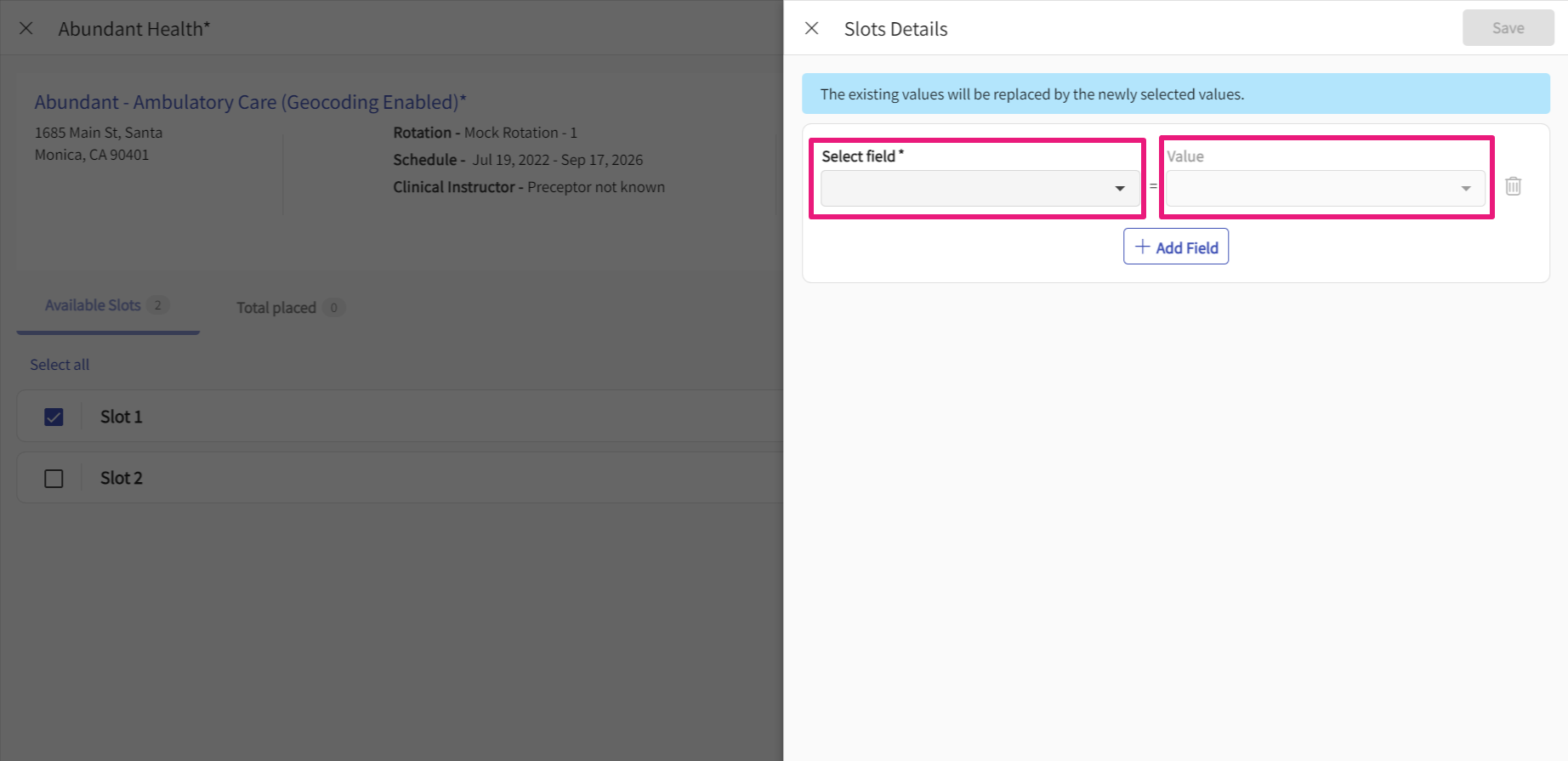 - On the Slots Details section, select Select field and Value from the drop-down list.