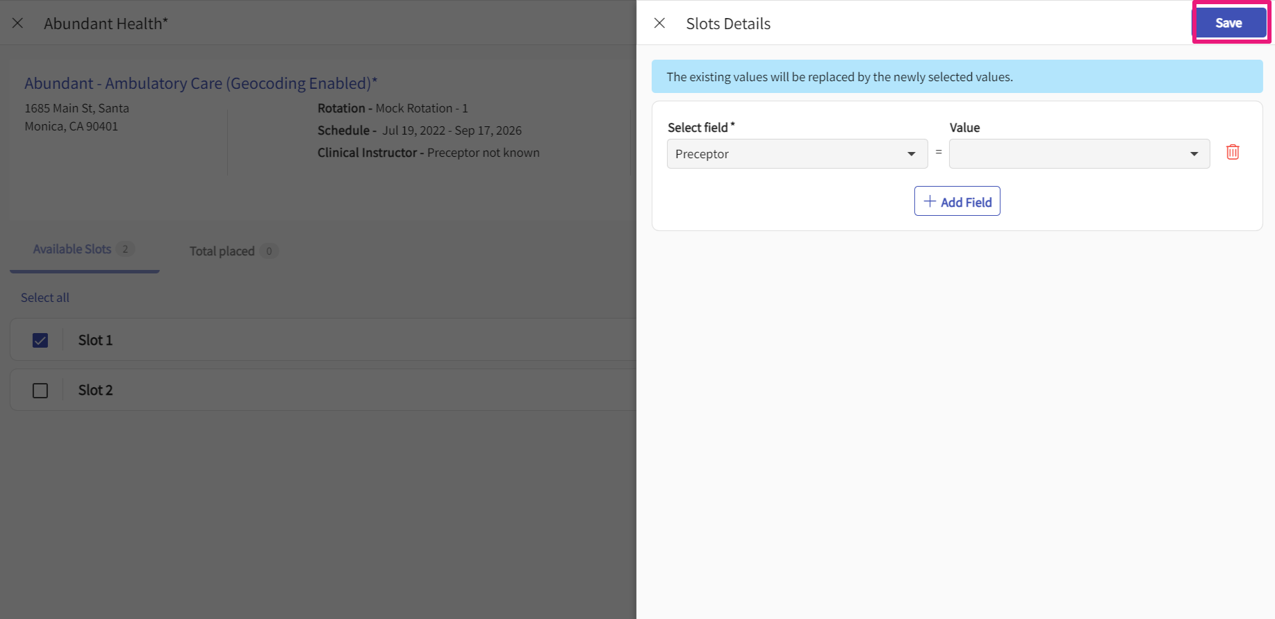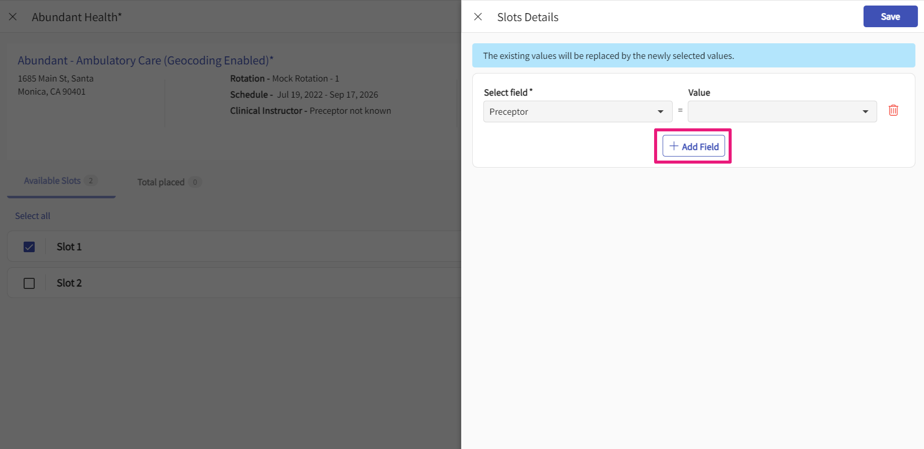 - If you’d like to add any slots for the course or placement group you have selected, click +Add Slot.