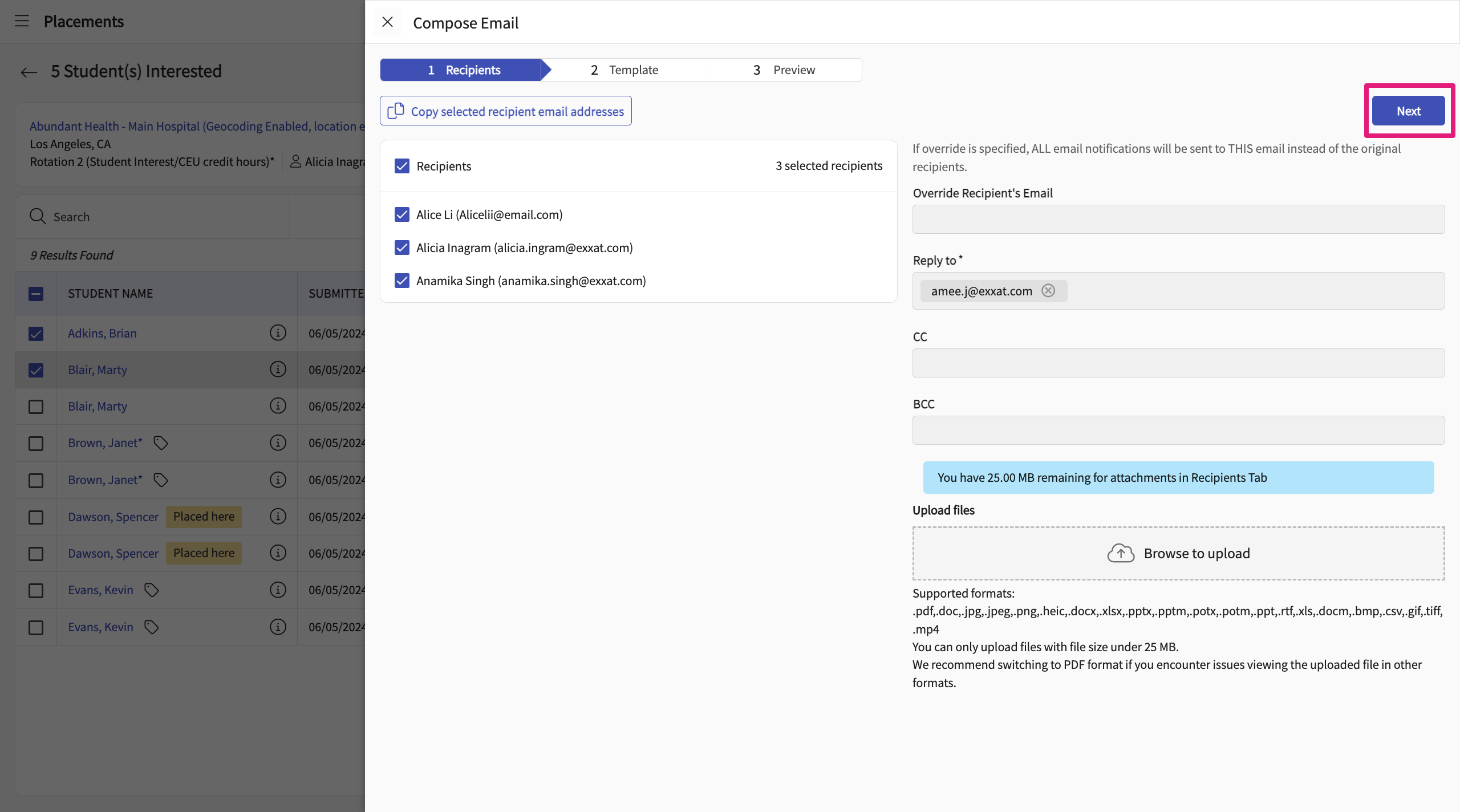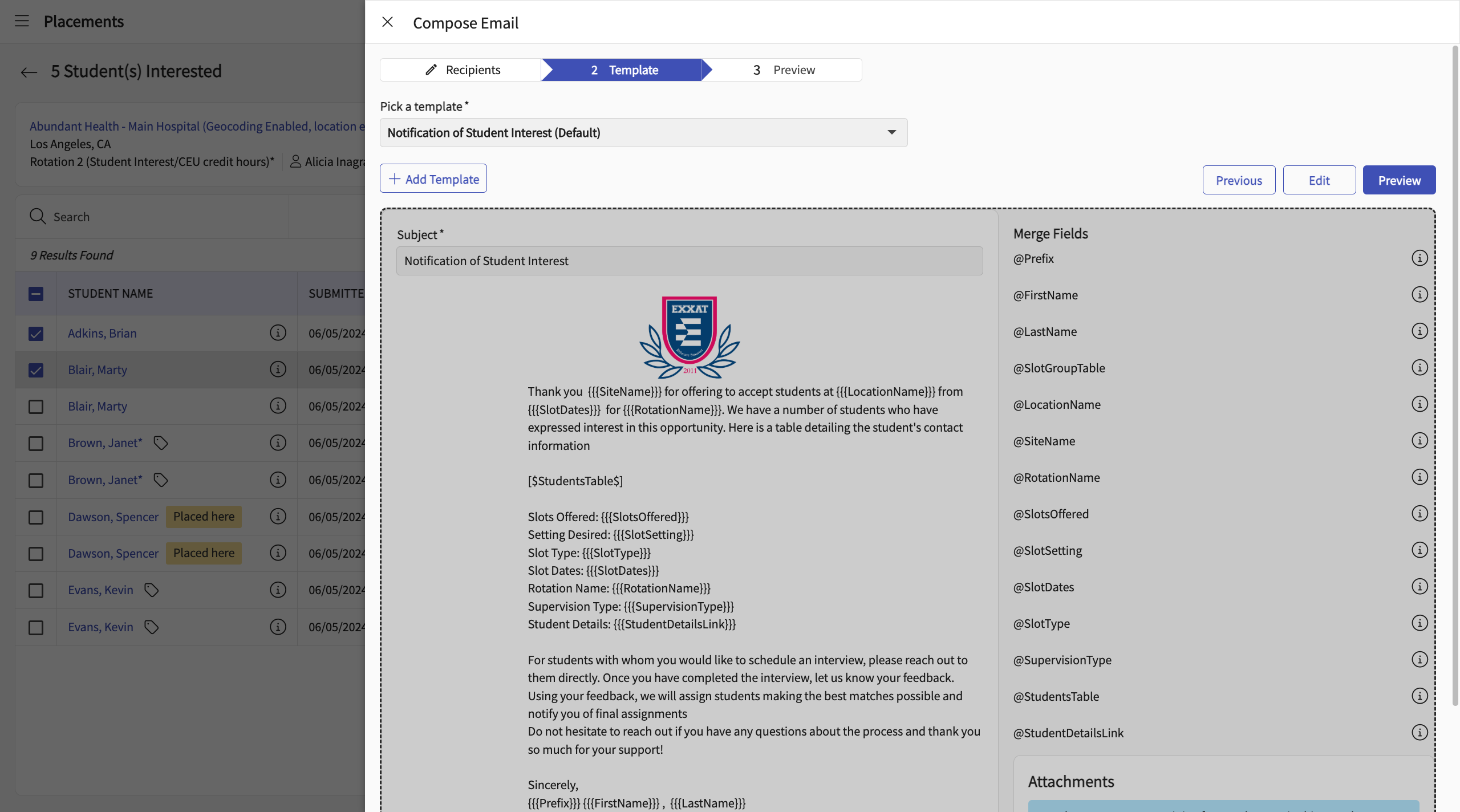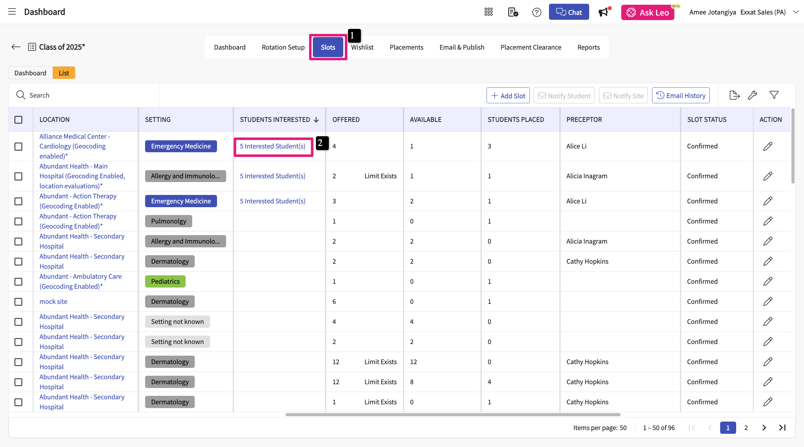 - Under the list view navigate to the "Students Interested" page to track which of the students are interested a given site
