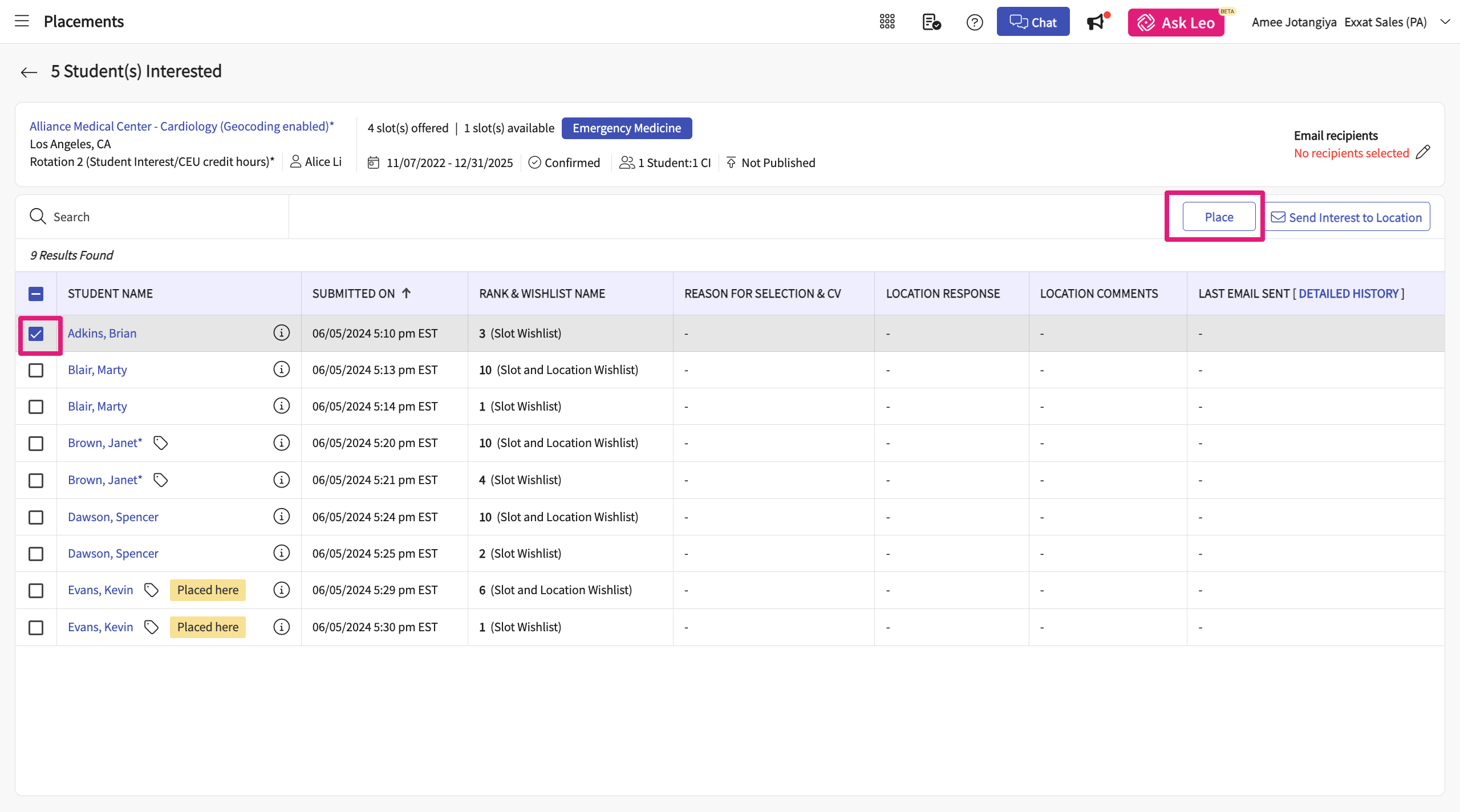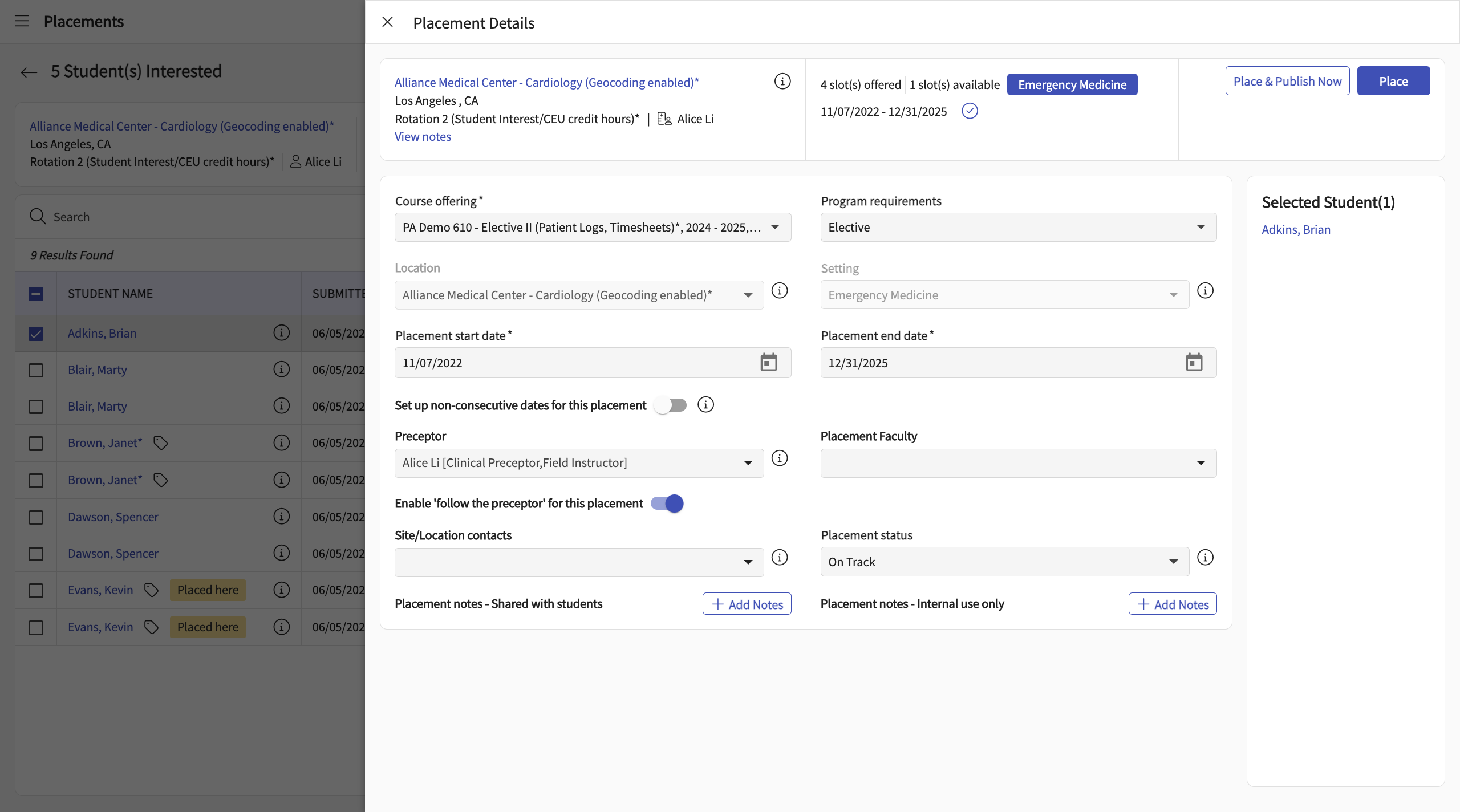 - Select the students you want to place directly
