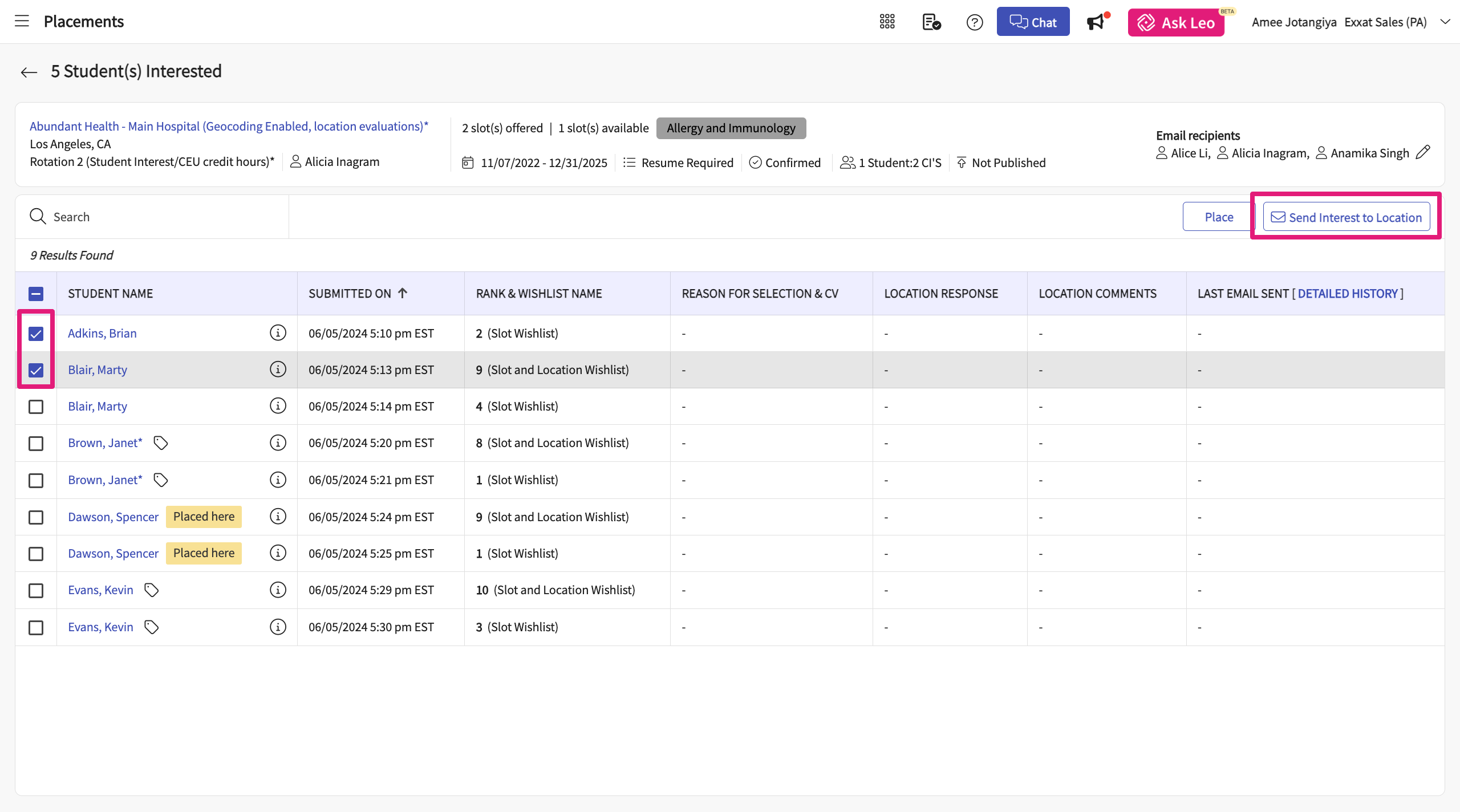 Click on the "Send interest to location" button to place the students
