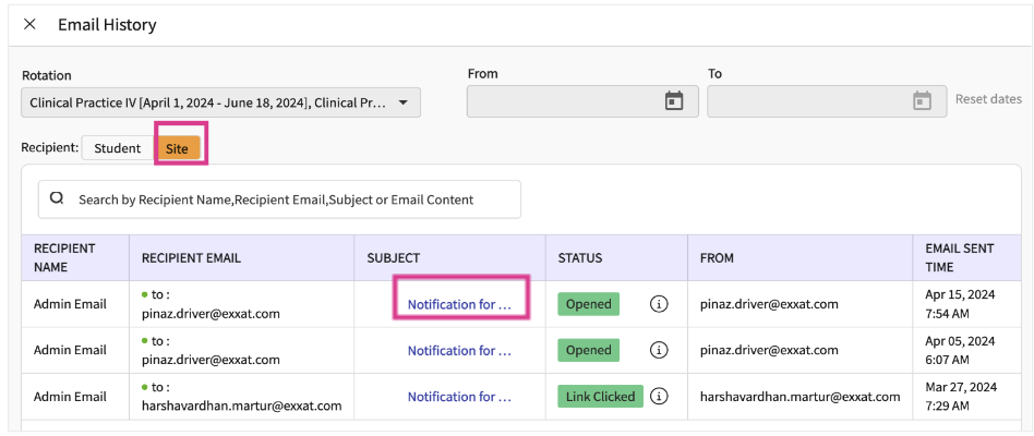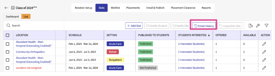 - Click on the Email History to view the email sent History for Slots to students or to Sites.
