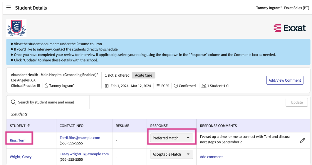 - To view site responses on interested students, follow steps 1-5 above (Select Placements > Select desired Course [or Placement Group > Placements for Group] > Slots > List.