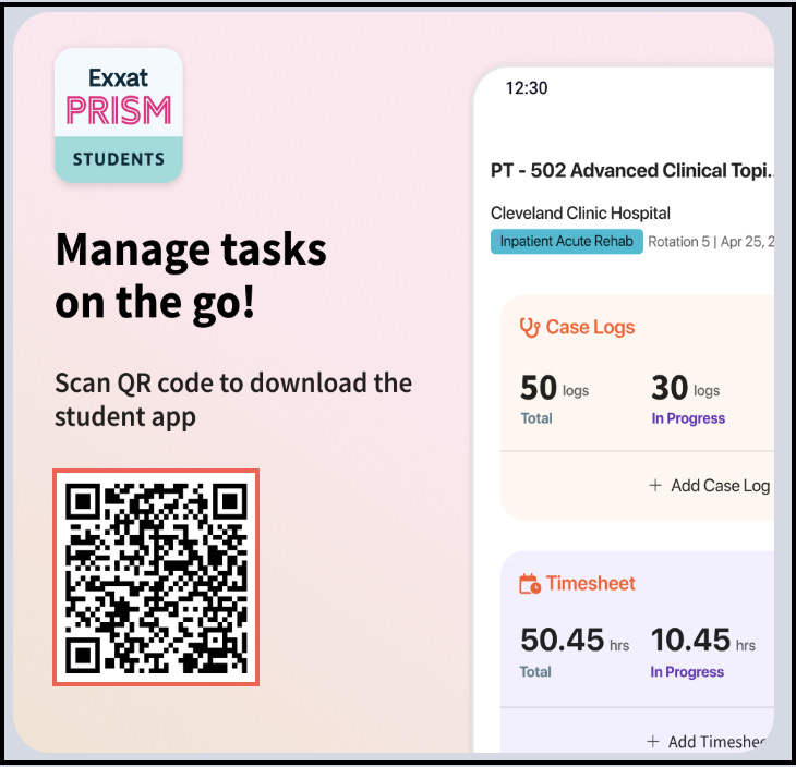You can also scan the QR code on the Exxat Prism Student dashboard to go to the App Store or Play Store and download the application.