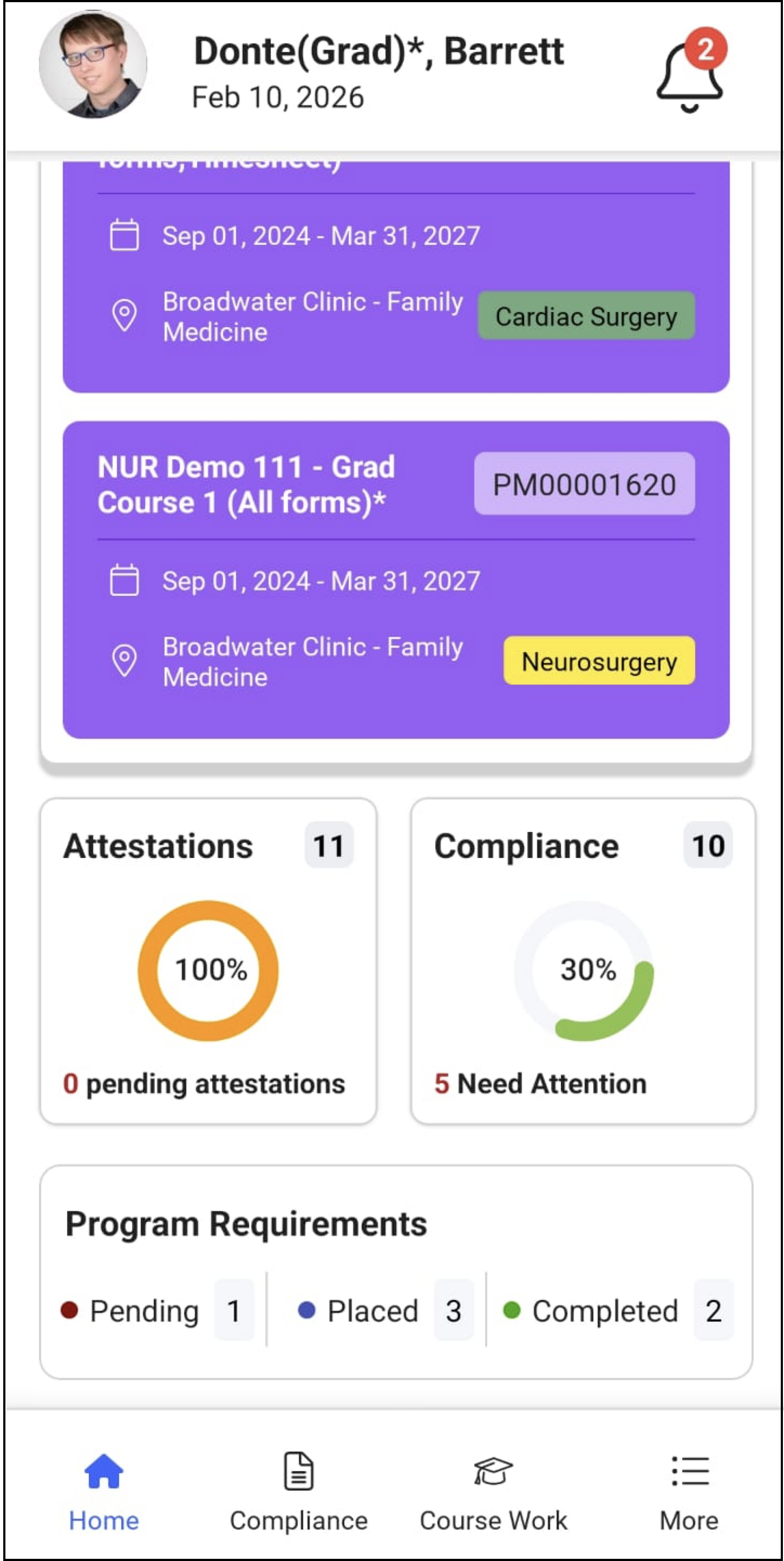 The Home Page functions as the primary dashboard of the Exxat Student app. It presents a consolidated view of current placements, school announcements, program requirements, and any pending compliance items or attestations.