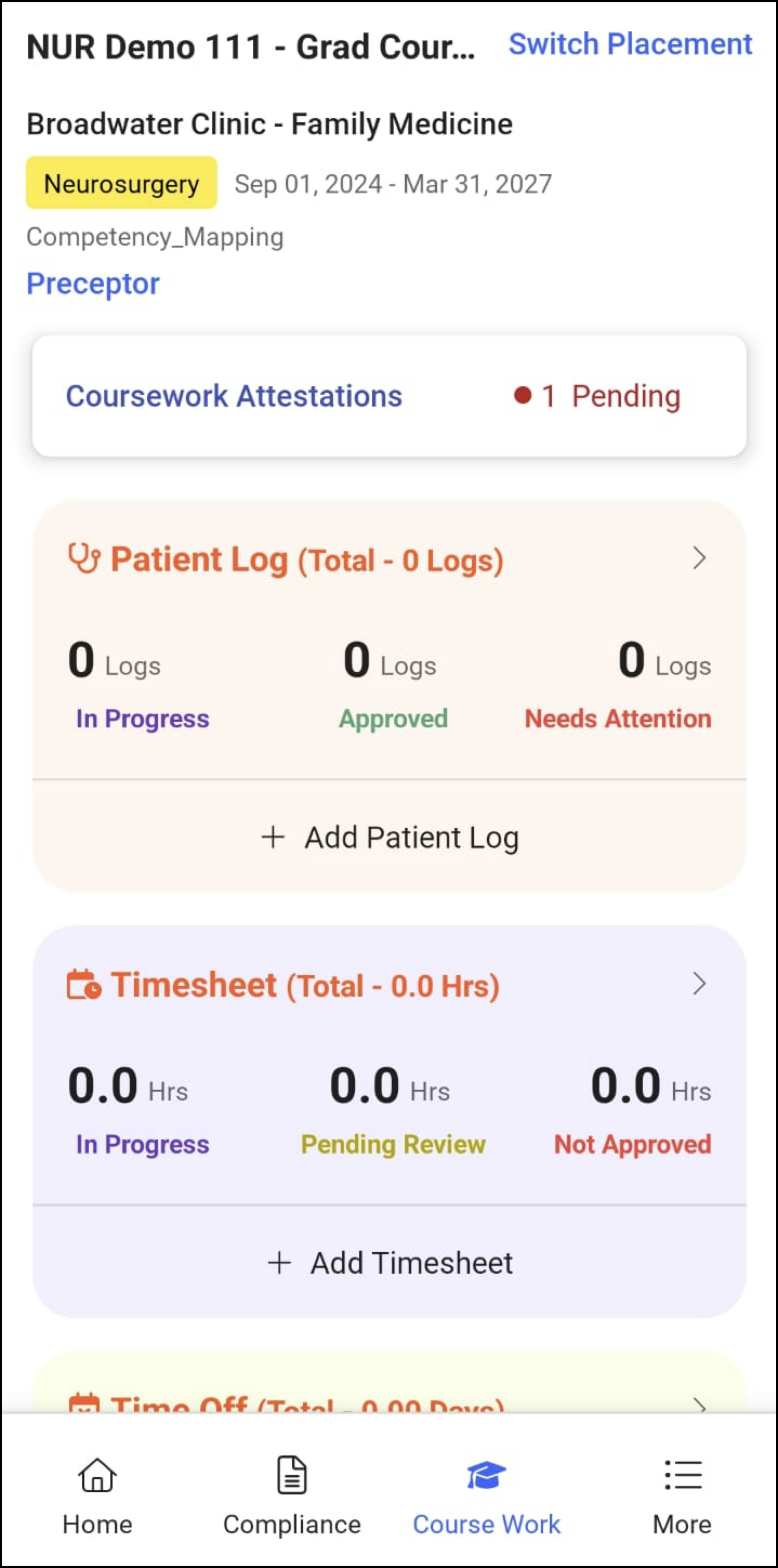 The Exxat Student Mobile application allows you to manage all educational activities through a clean and intuitive interface with four primary navigation tabs Home, Compliance , Coursework and More.