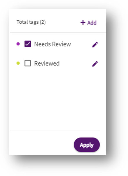- Click on “+ Add” icon. Add the name of the tag in the text area. In the example below we have added “Needs Review”. You can also choose a color for it by clicking on the paint icon next to the name and click add once done.