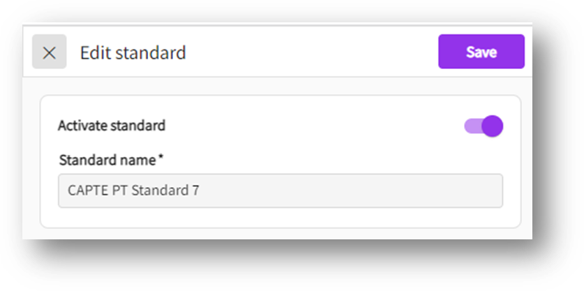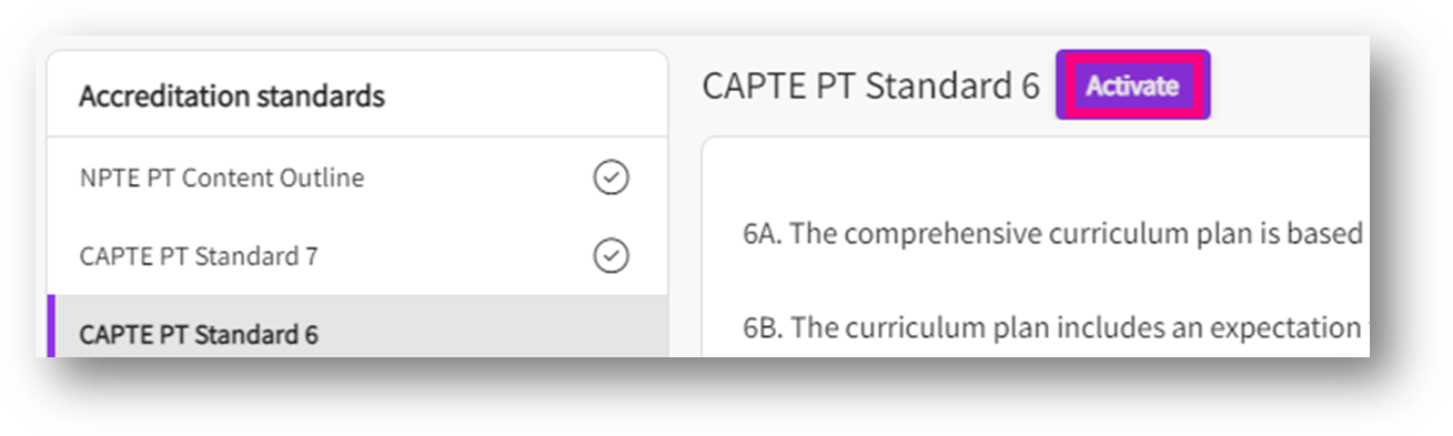 - This will take you to standards screen where you can activate, edit, and delete accreditation standard details.