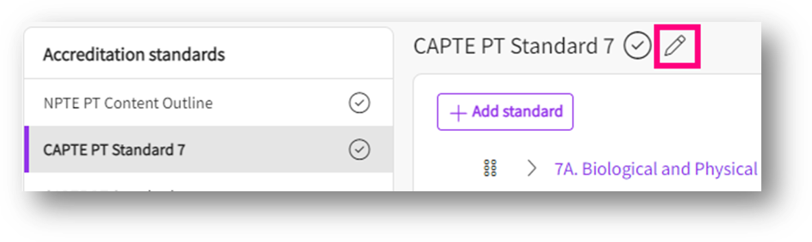 Select the standard you would like to deactivate from the left panel. On the right-hand side of the page, click on the edit pencil.