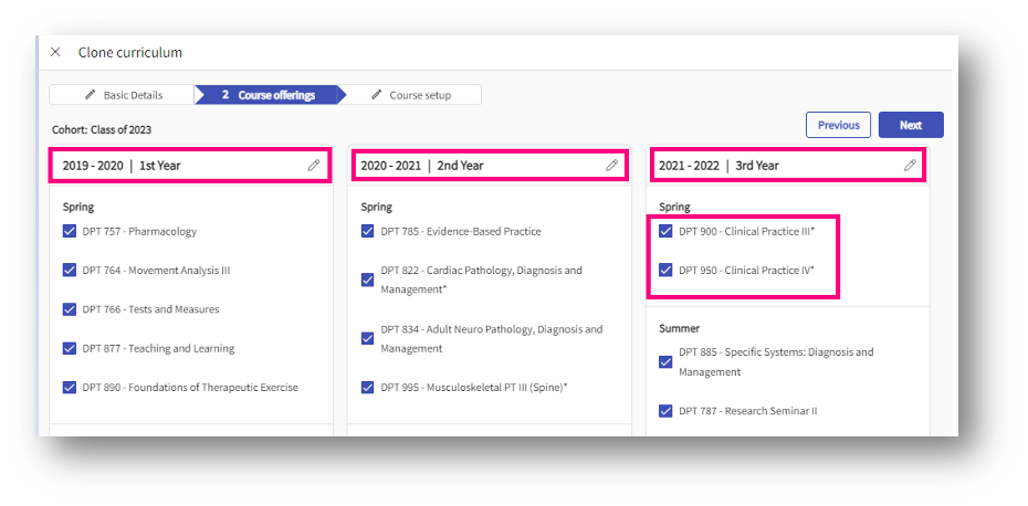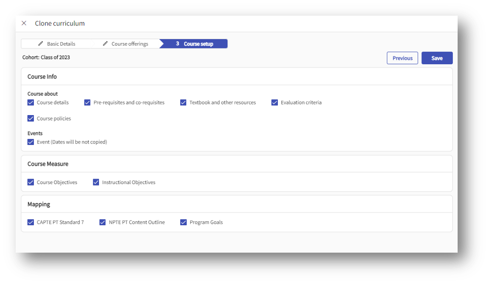 - Course Setup: This is where you decide what information from previous curriculum you would like to bring over to the new curriculum such as the details, objectives, mappings etc