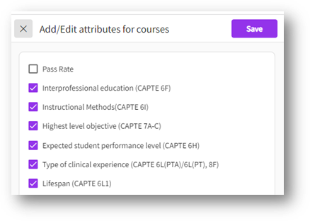 - A drawer will appear showing you a list of all courses and course measures attributes. Select all attributes that you would like to associate at the course level and click Save.