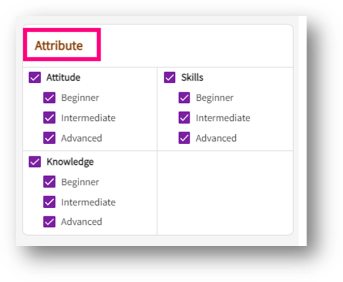 This is a special mapping report that allows the program to showcase progression of student learning as they go through the curriculum from matriculation to graduation. The program may choose to define the learning areas (knowledge, skills, attitudes) at different Bloom’s levels (novice, intermediate, advanced). The labels for ‘areas of learning’ and the ‘levels’ are customizable and defined by the user.