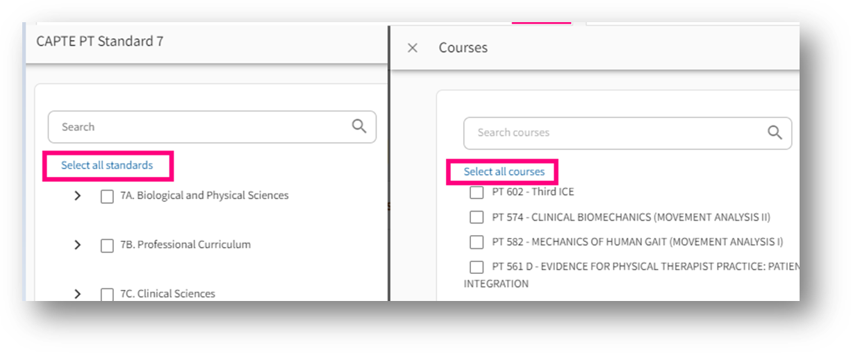 - Once you click on “Get customized excel report” , you will be able to see two places to select “Standards” and “Courses” as shown below in the screenshot. Click on “+” icon for each and select specific/all standards and courses for which you wish to view the report and click save.