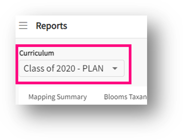 - This takes you to the Mapping summary dashboard. On top left hand side you will find a drop down menu which will allow you to change the “Curriculum/cohort” for which you wish to see the reports for.