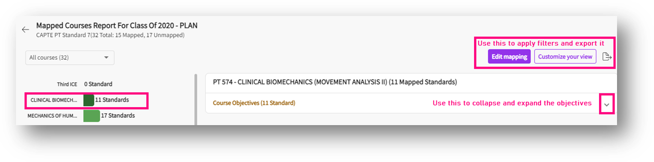 - Mapped standards: This will only list out all the standards mapped to the courses without showing the course measures/objectives.