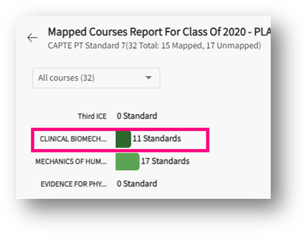 - When you click on the bar, it takes you to the report screen for mapped courses as shown below