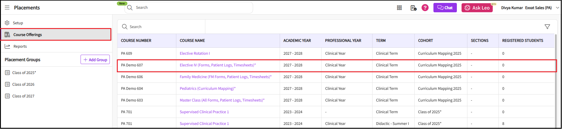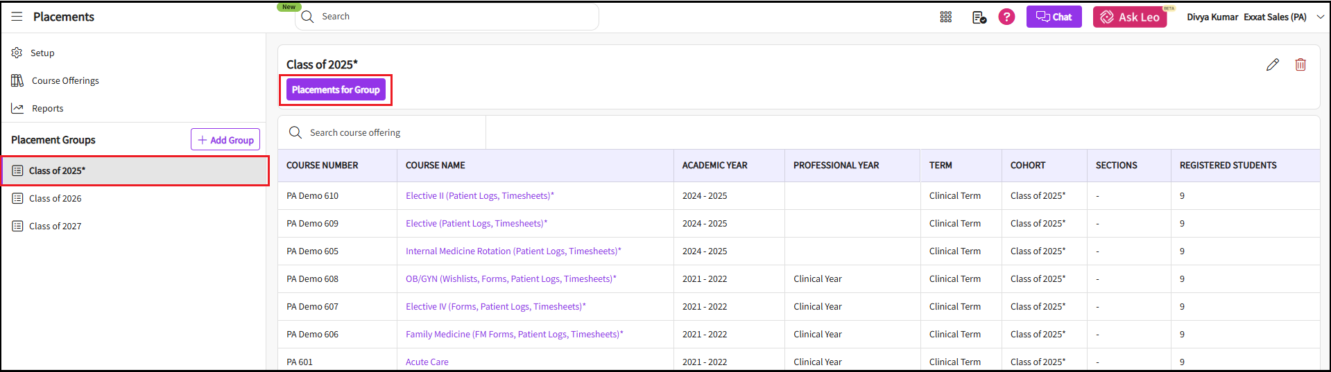 You can also select a placement group to manage multiple courses at a time - If you selected a placement group, click Placements for Group.