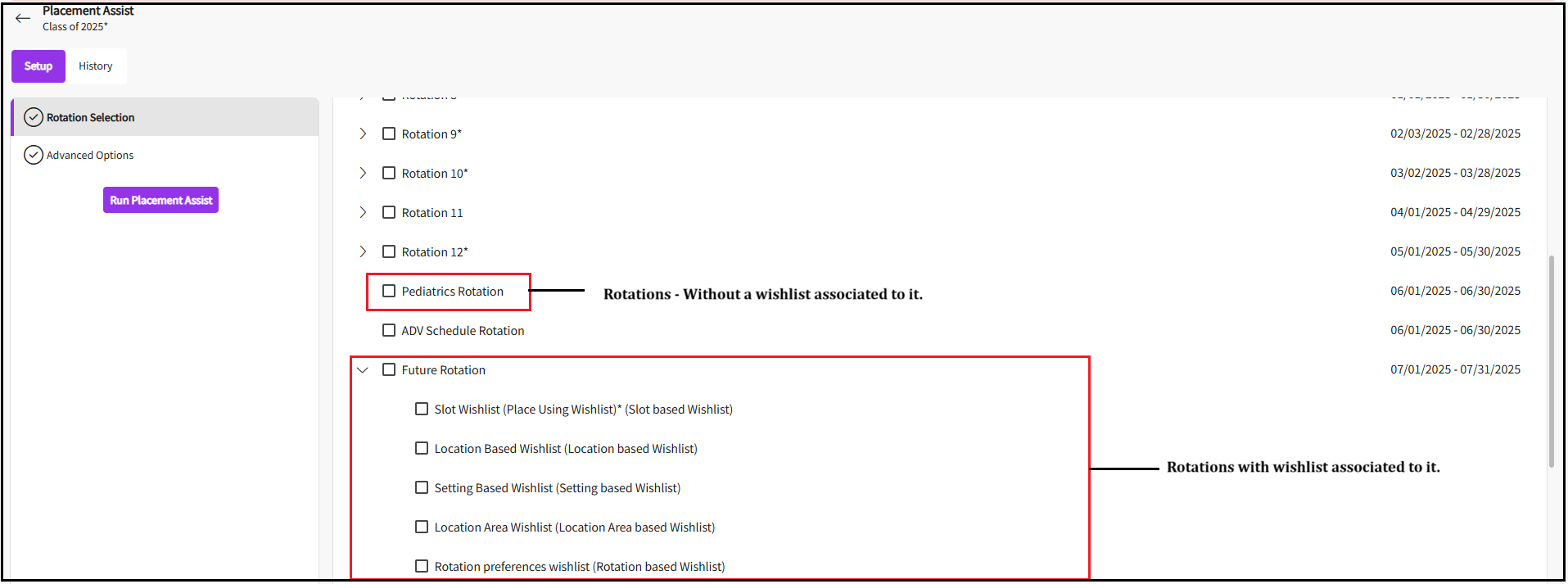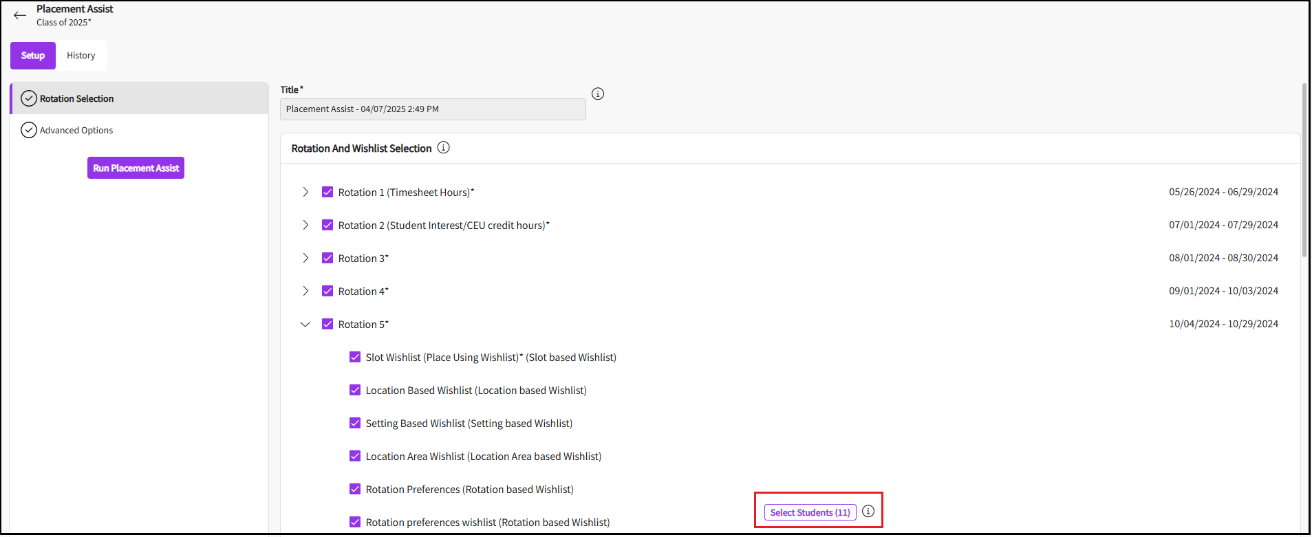 - The system navigates you to the Placement Assist- Setup page. Select the rotations you would like to include in your placement assist.