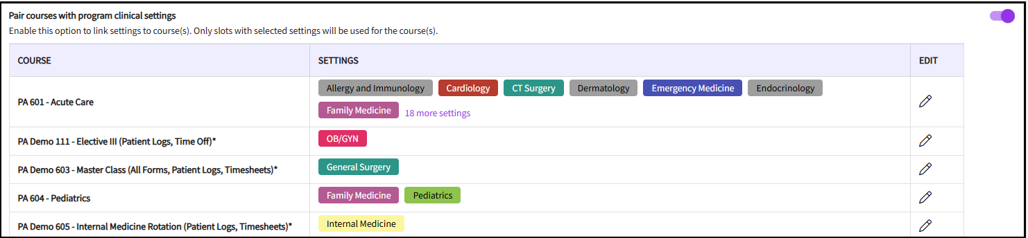 Pair courses with program clinical settings: