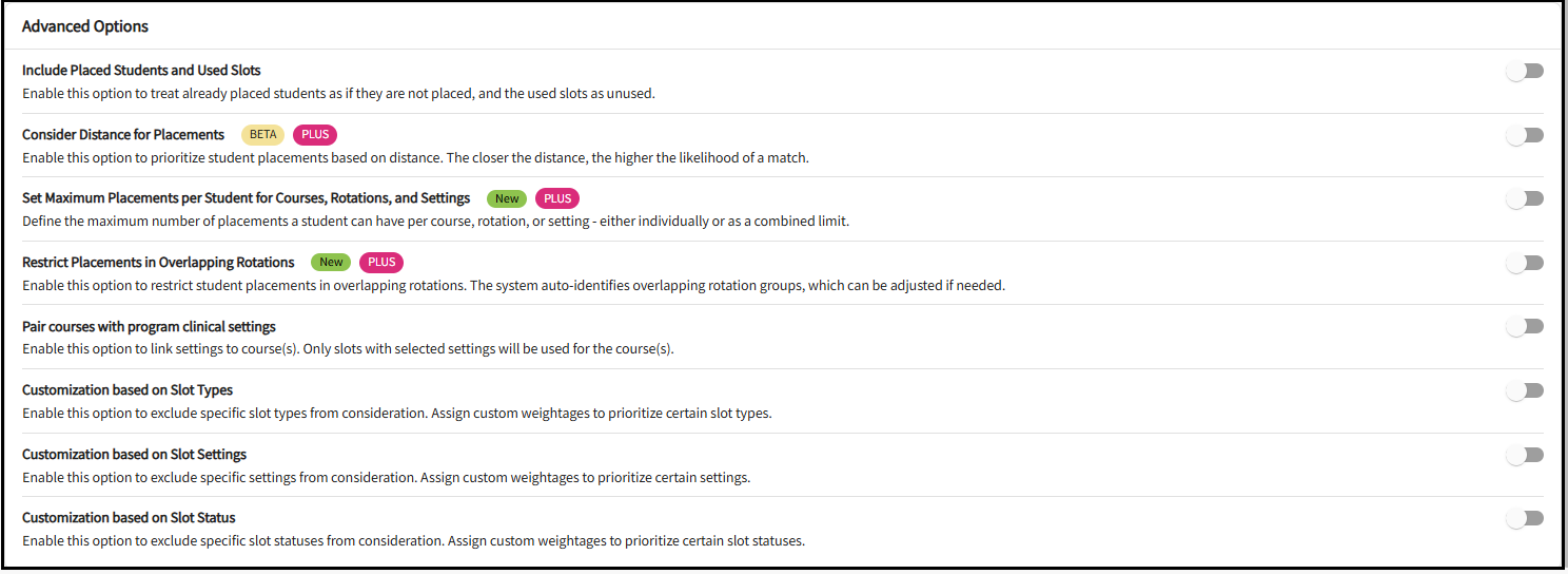 For detailed explanation of the Advanced Options see article Advanced Options in Placement Assist.