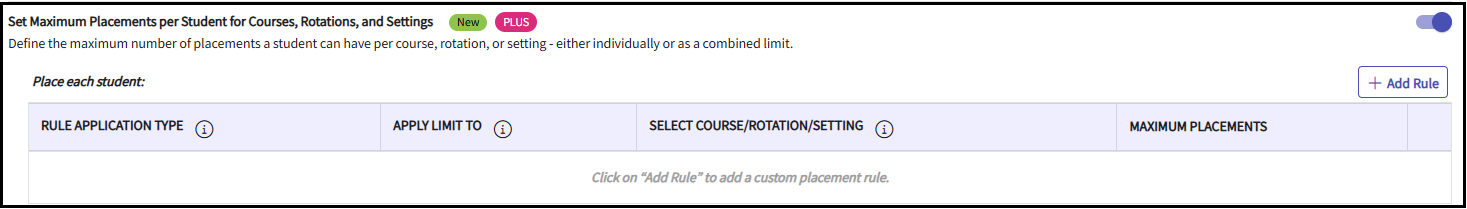 Use the "Set Maximum Placements per Student for Courses, Rotations, and Settings" option to define the maximum number of placements a student can have for courses, rotations, and settings either individually or as a combined limit.