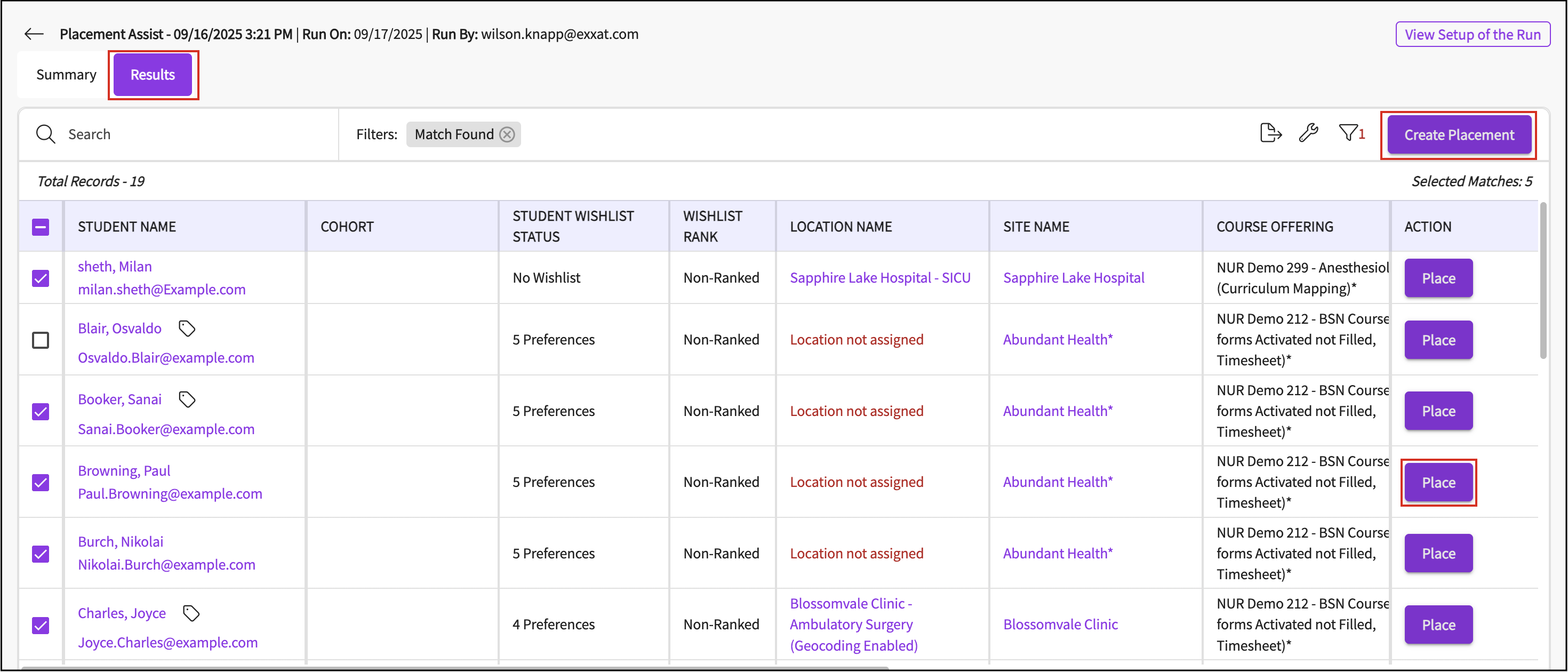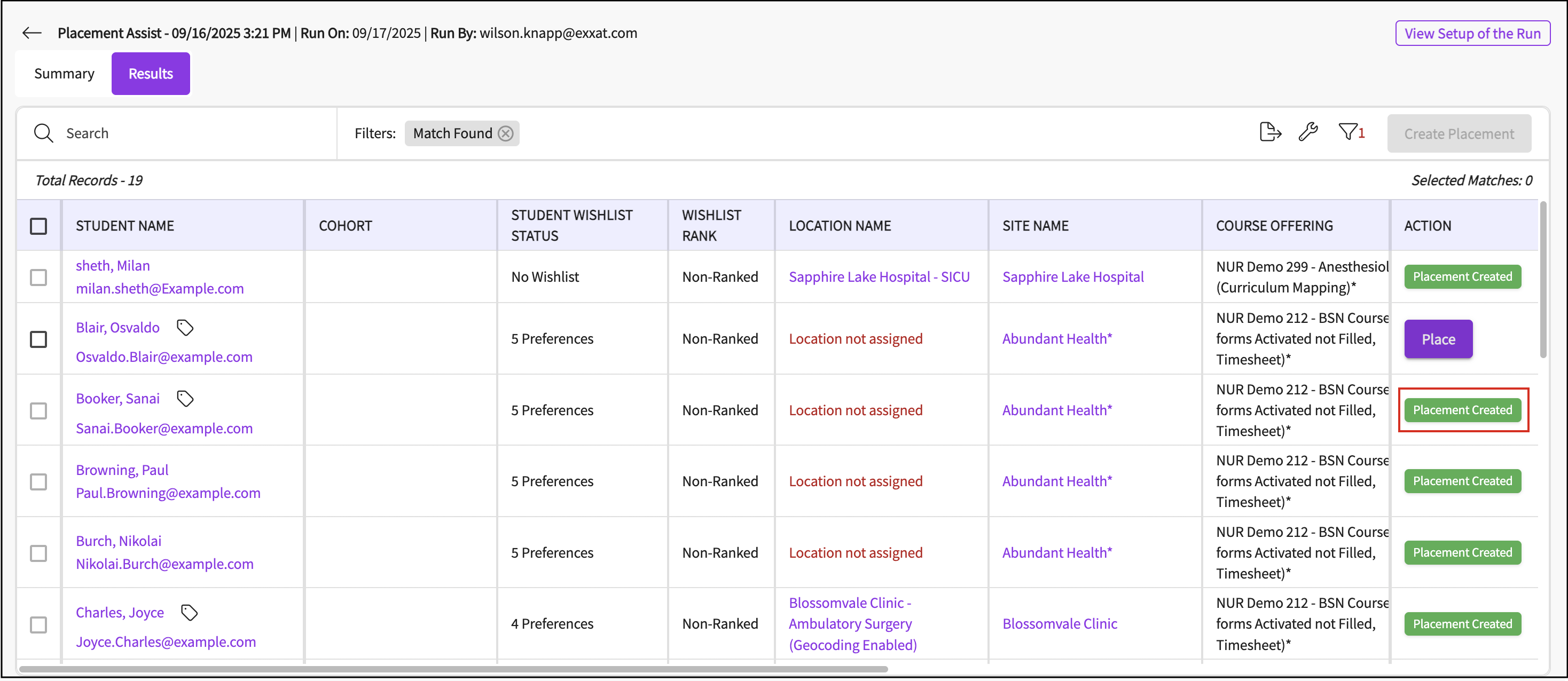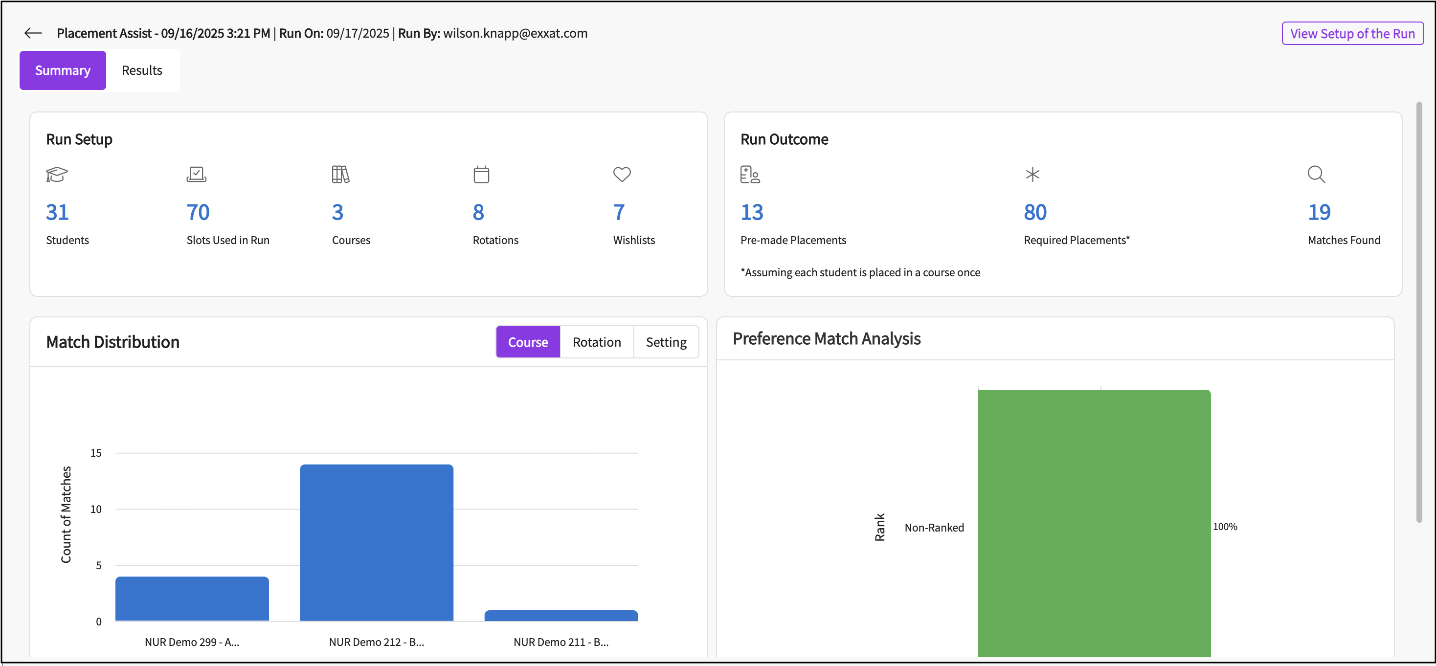 You will see a Summary tab with the graphical insights and key numbers that highlight the outcomes of the placement assist run. It includes details such as Run Setup, Run Outcome, Match Distribution, and Preference Match Analysis.