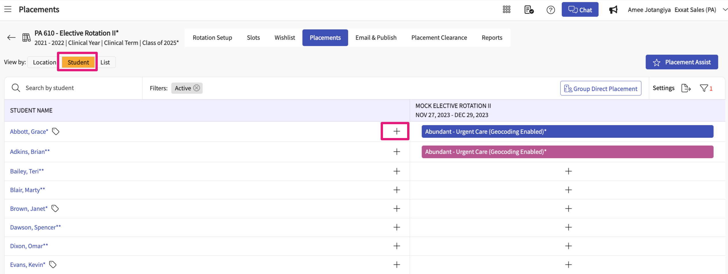- Search for the student and rotation, and click on the + sign to add placement information.