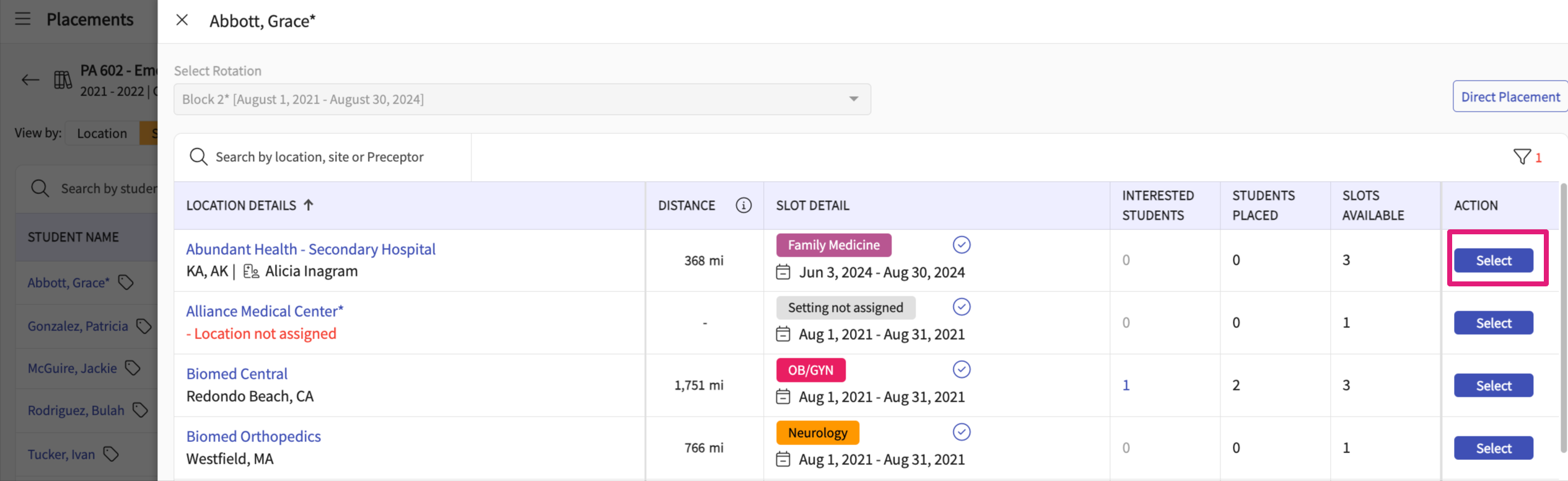 - The drawer will then show you all available locations. Click the Select button for the Location you'd like to place the student in.