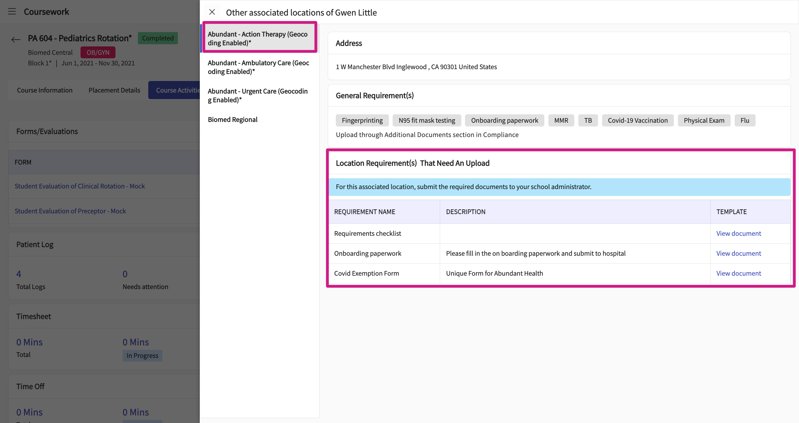 Your school may want to share other locations (including requirements) associated with your placement preceptor. You can access this information via coursework tab.