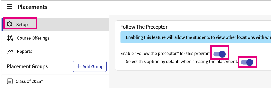 - Click on the Setup option from the left-side menu and enable the “Follow the Preceptor” toggle button, Select the default option to enable the Follow the Preceptor for all the placement.
