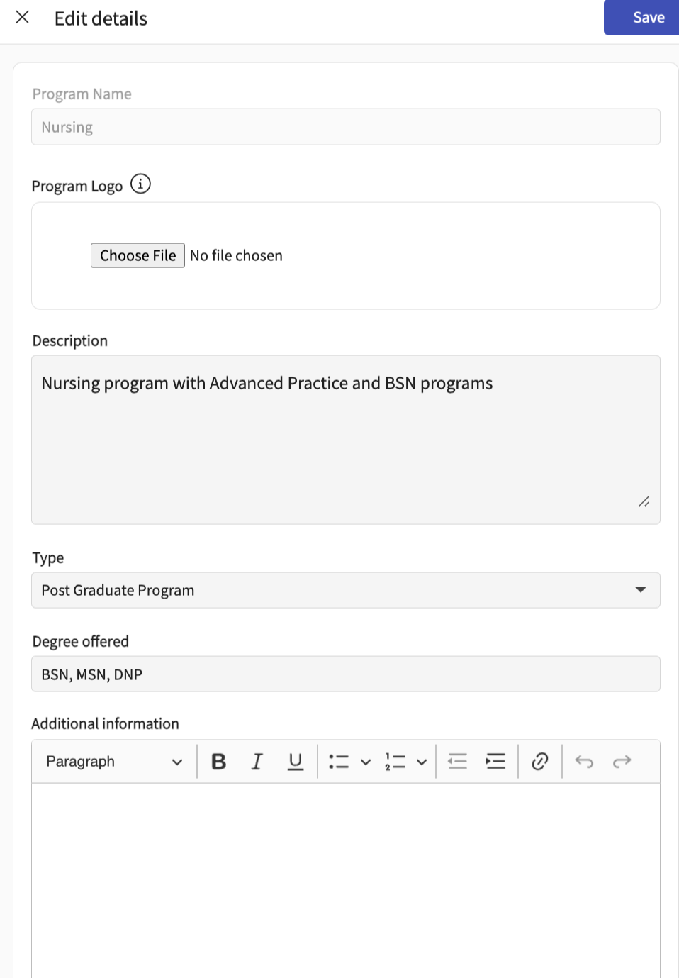- Additional program information: enter any additional details not mentioned above.
