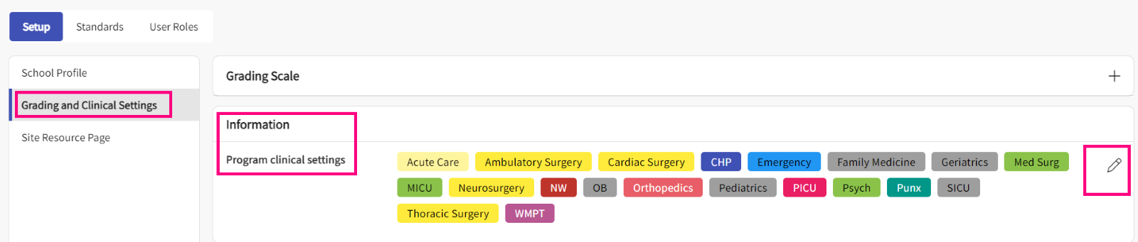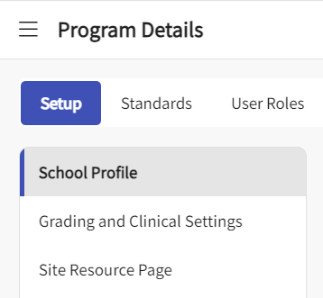 The following page will appear. You’ll be taken to the Setup page where you will be able to view and manage the school profile, grading and clinical settings and setup the site resource page.
