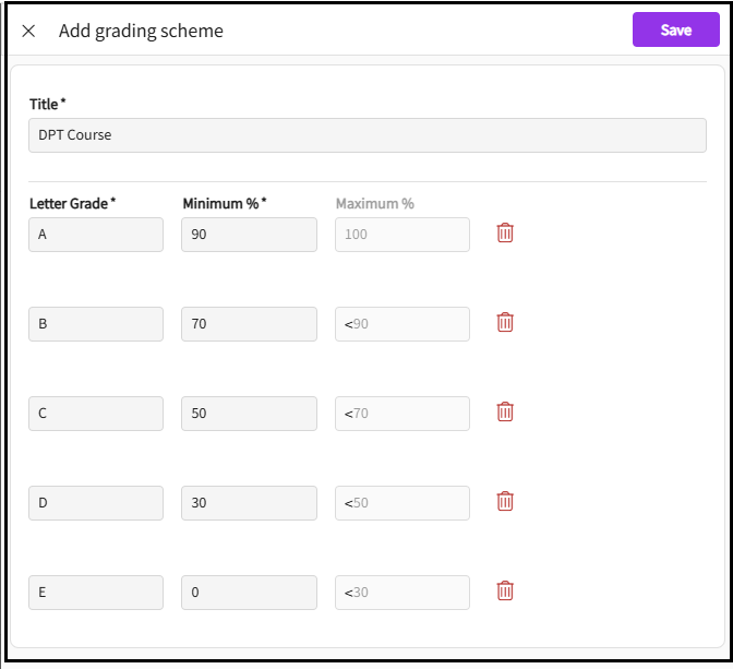 To delete the Grading Scheme, click the trash icon next to the grading scheme.