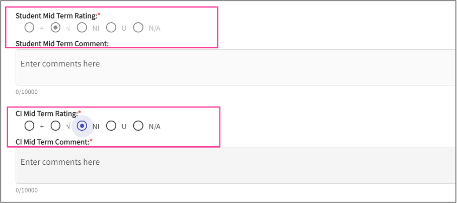 - For each question, you will see the student’s rating and comment, and a place to add in your own rating and comment.
