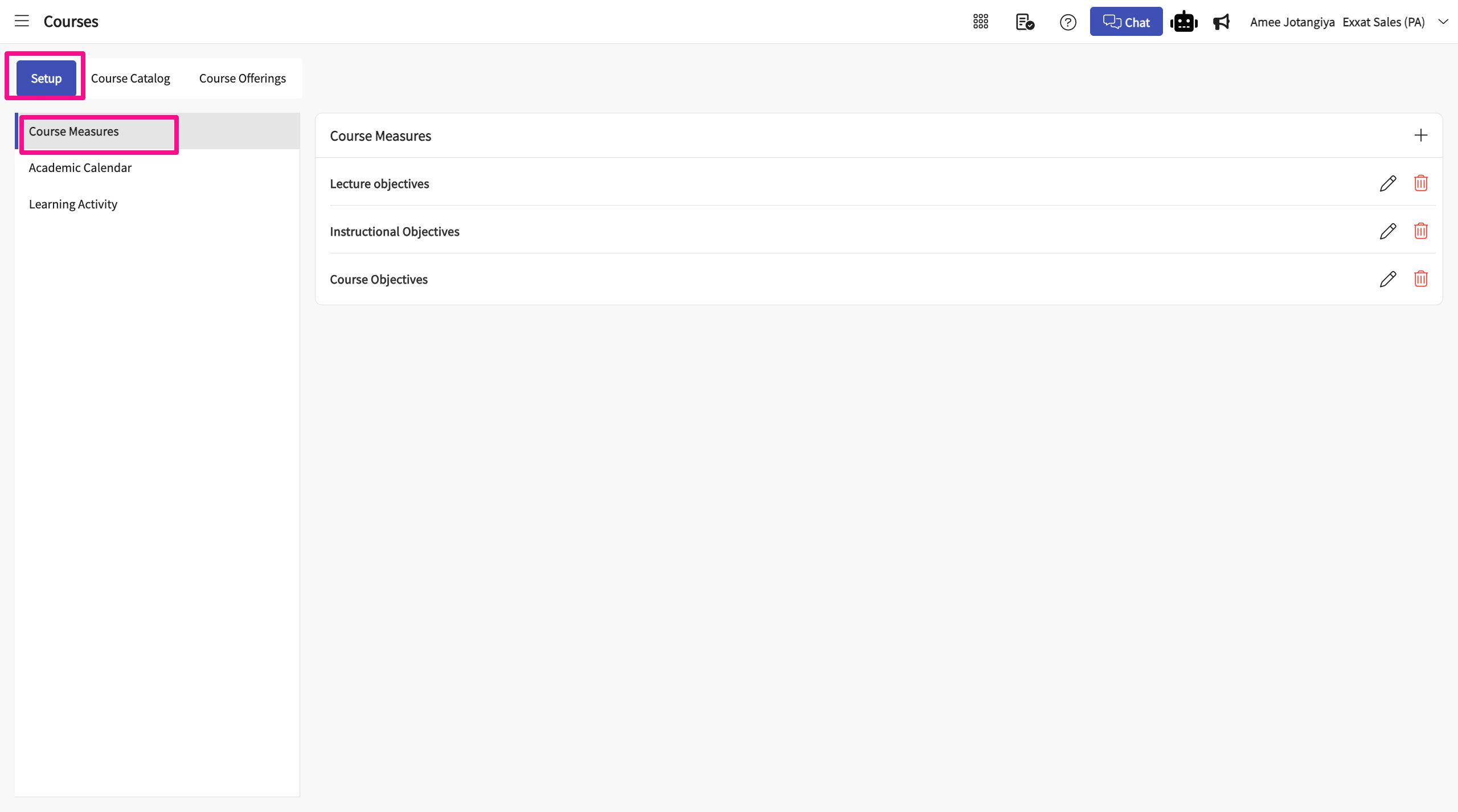 - On the page that loads, go to Setup from the horizontal menu. Click on Course Measures from the left panel. This will take you to course measures screen where you can manage your course measures details.