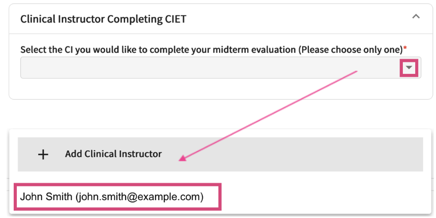 9. In the dropdown, if you have not added a CI yet, you may see an option "+Add Clinical Instructor". Clicking on that will open a drawer for you to enter your CI's information.