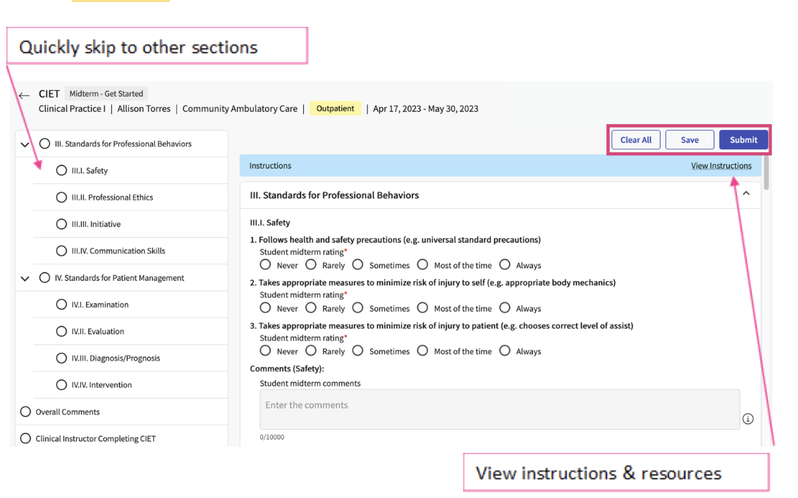 Note: before you start your CIET you should enter a CI. To add a CI, in the Clinical Instructor section, click on the + icon (you'll be able to add one before you submit the CIET in case you forget).